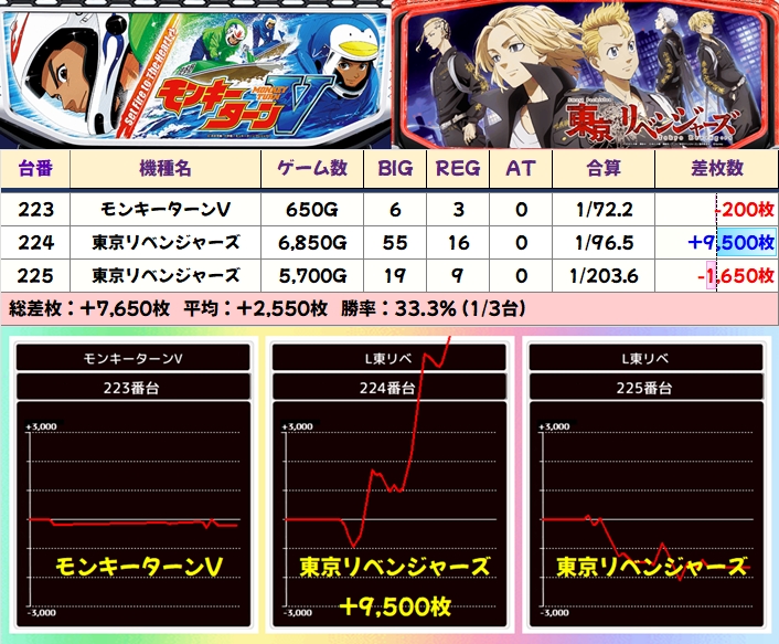 また、先月導入された「東京リベンジャーズ」にも単品が用意されており、+9500枚の大幅プラスを叩き出していました!