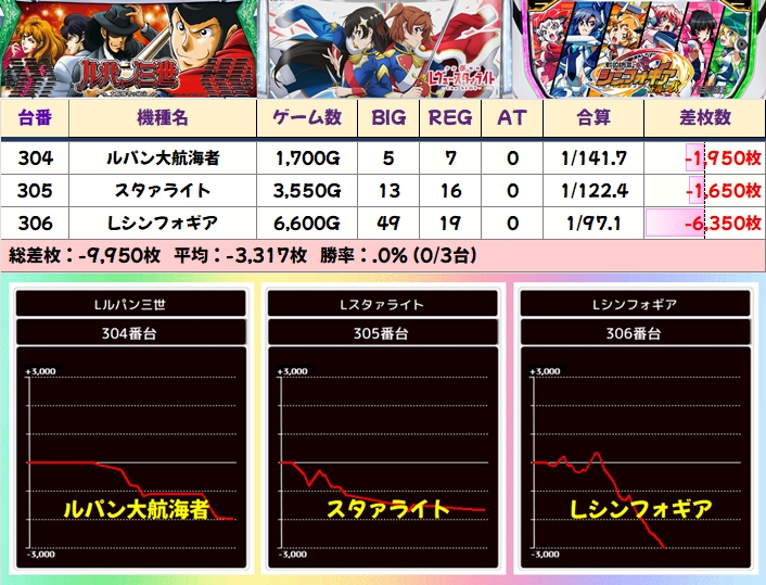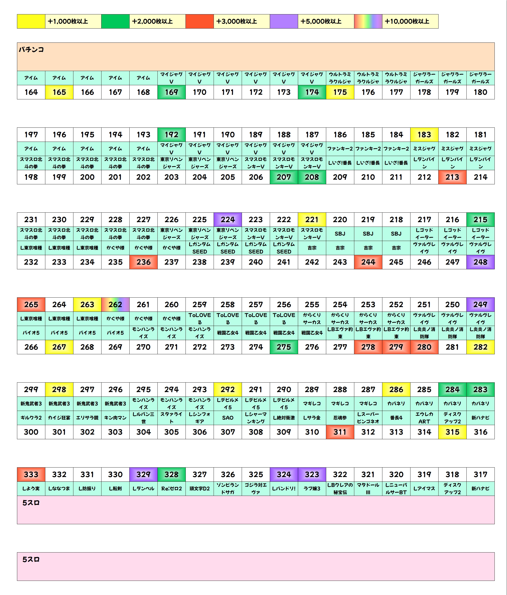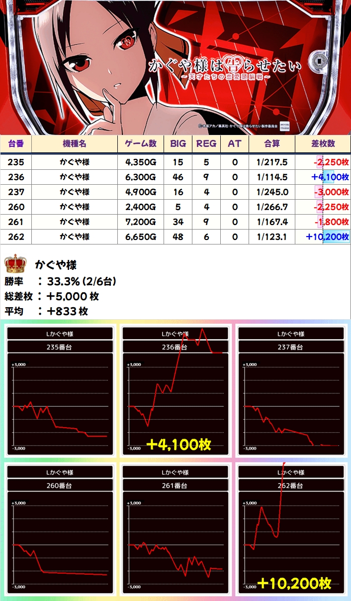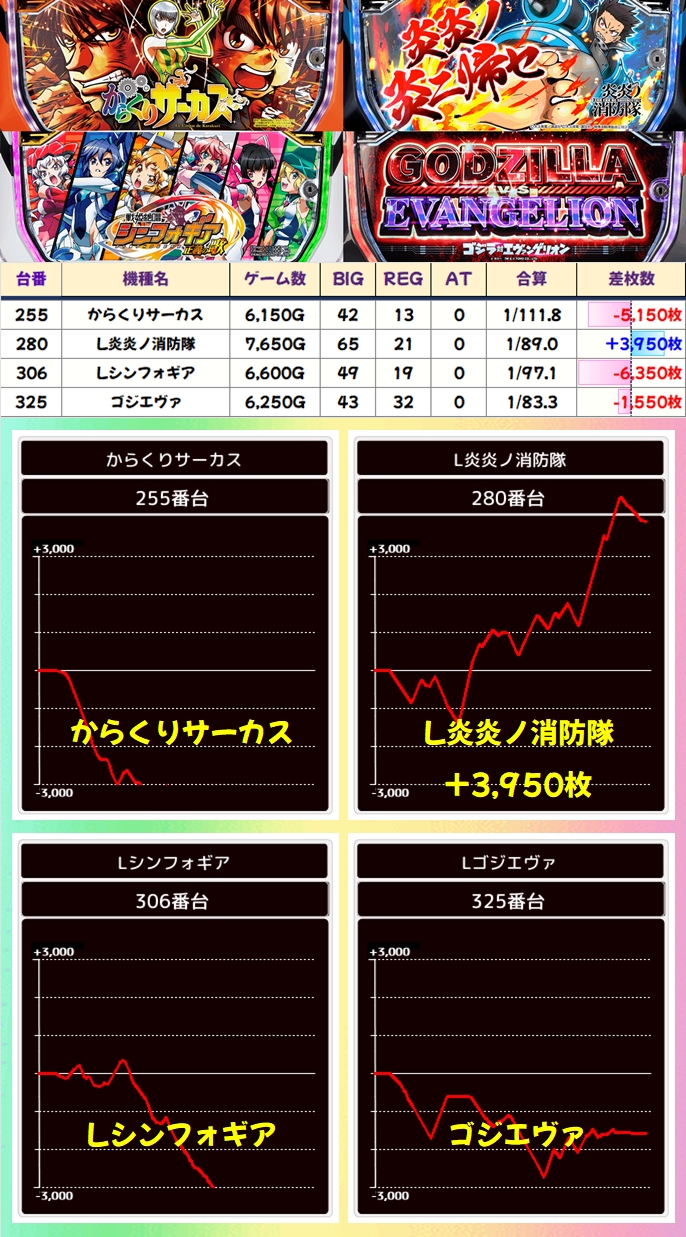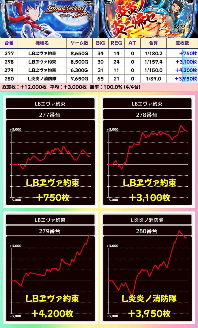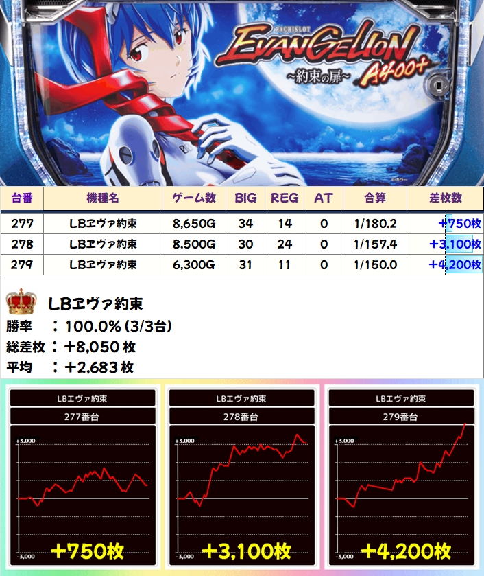 今週の水曜日は狙い目機種から複数の仕掛けを確認でき、「ヴァルヴレイヴ」「かぐや様」の1/2系に加え、3台設置の「LBエヴァ約束」が全台系と思しき結果に!