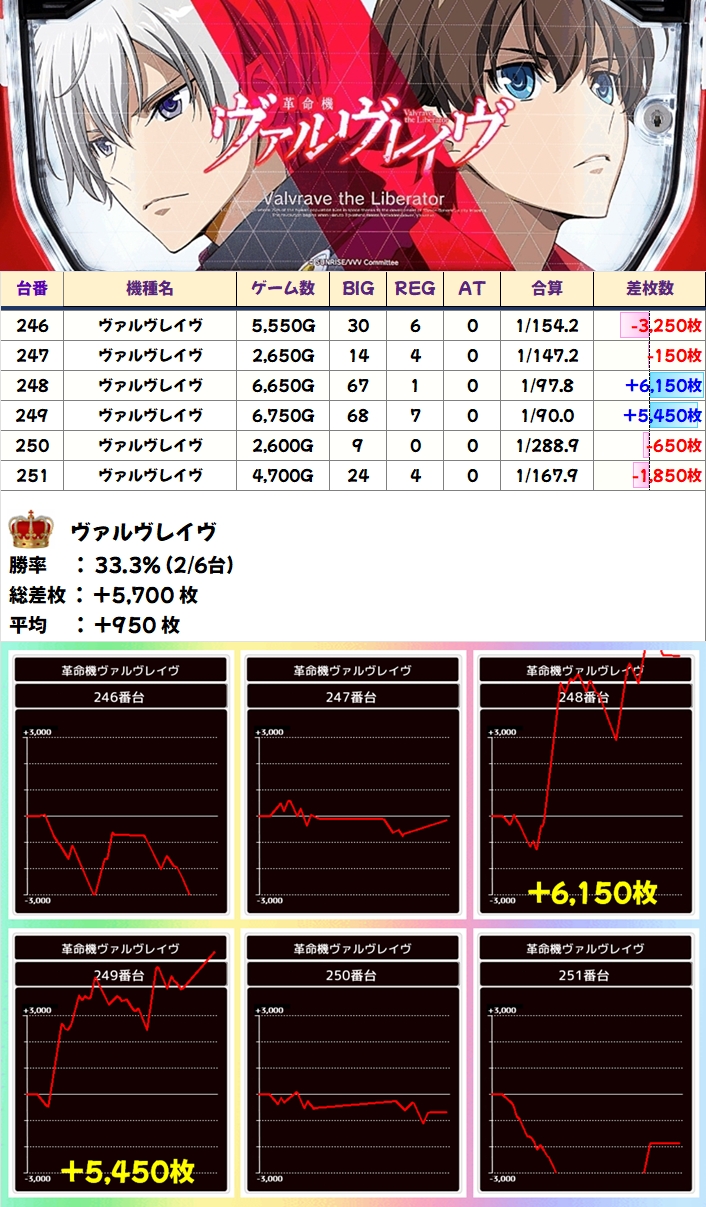 また、定番の機種マタギの並びに加えて島マタギの並びも用意されており、今回は「ヴァルヴレイヴ」の248~250番台うが島マタギの並びに!