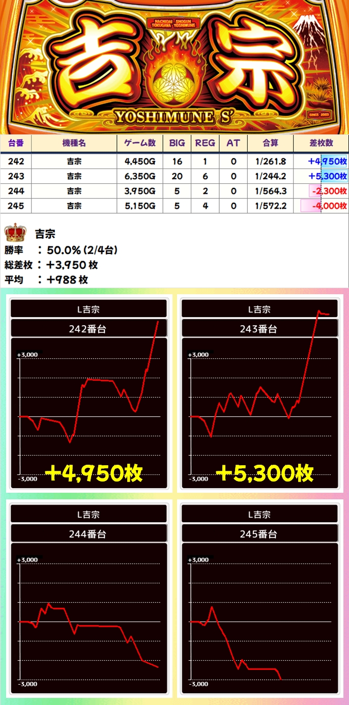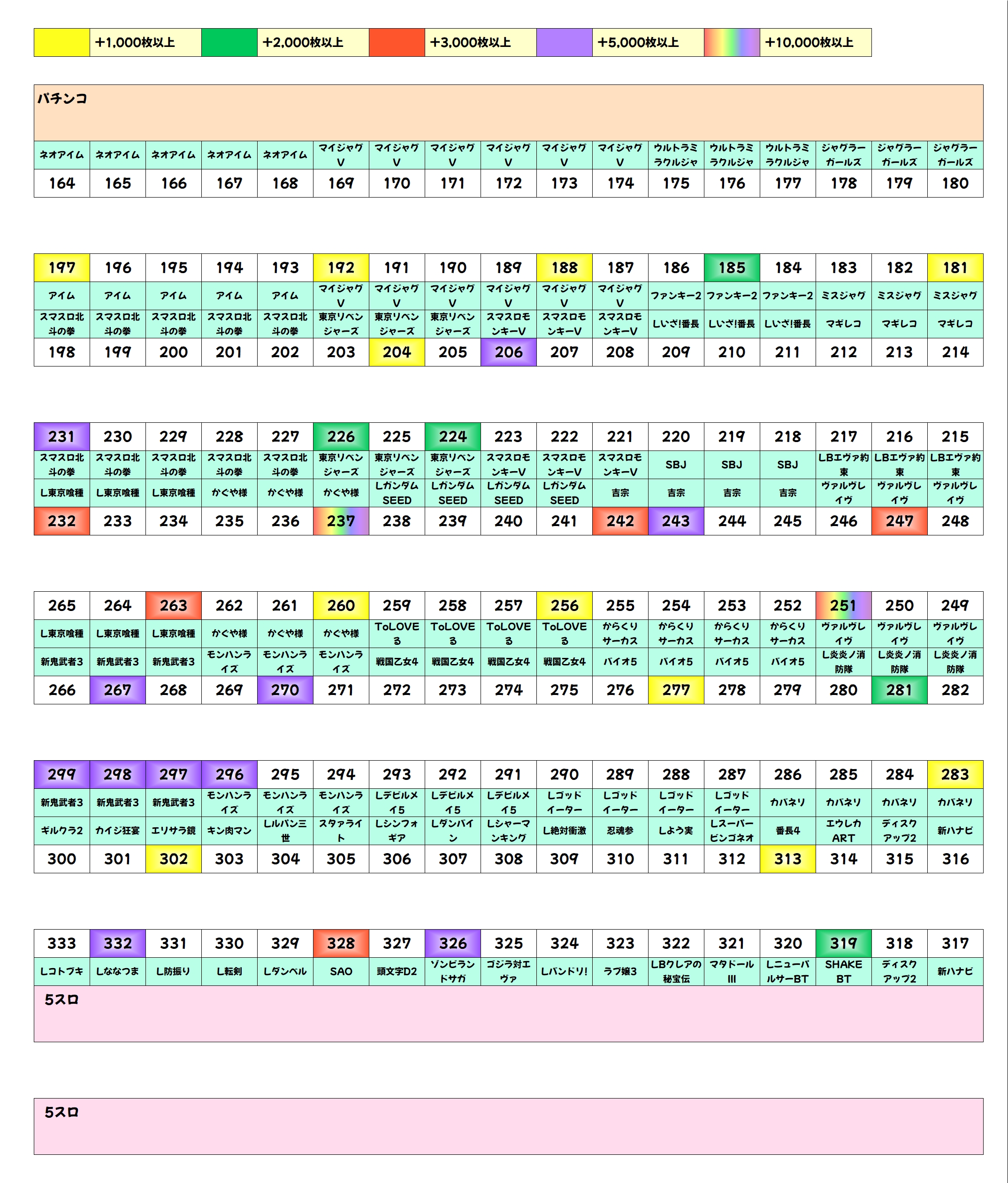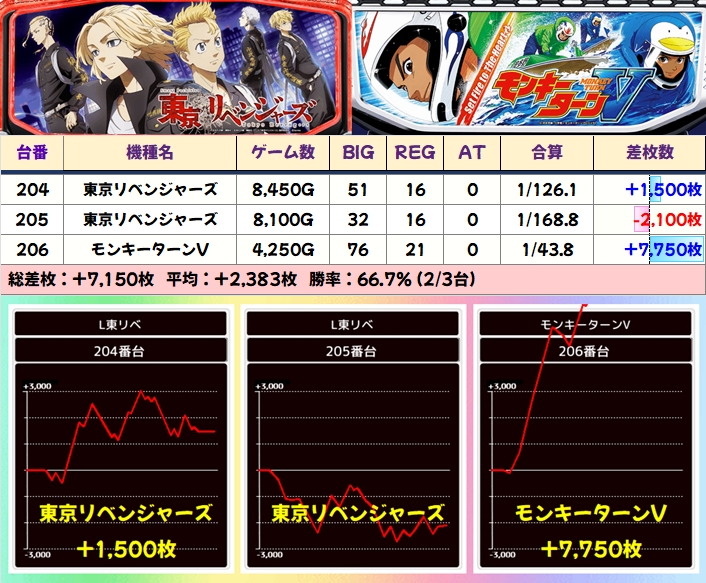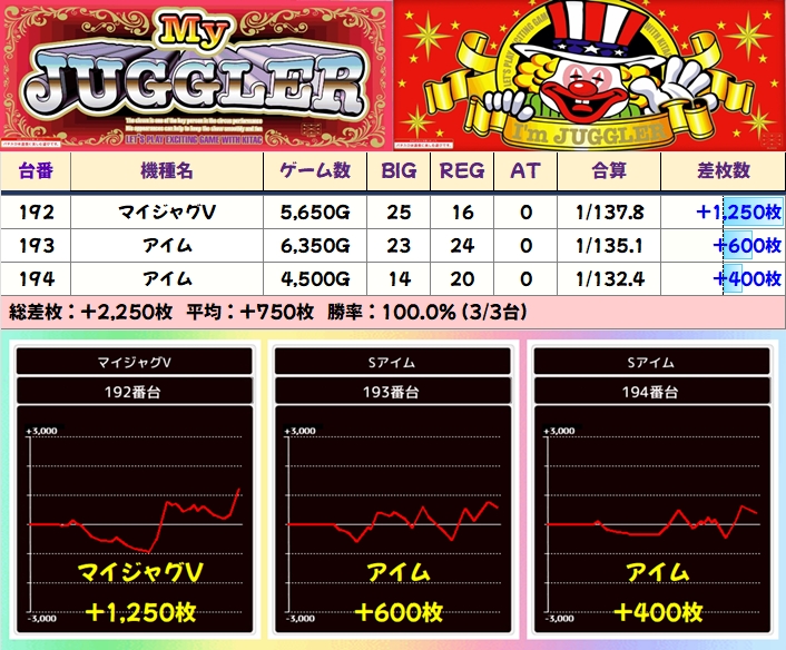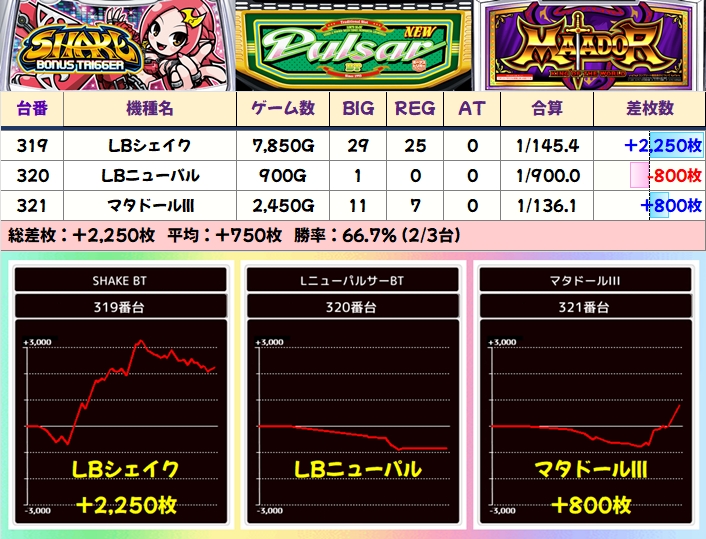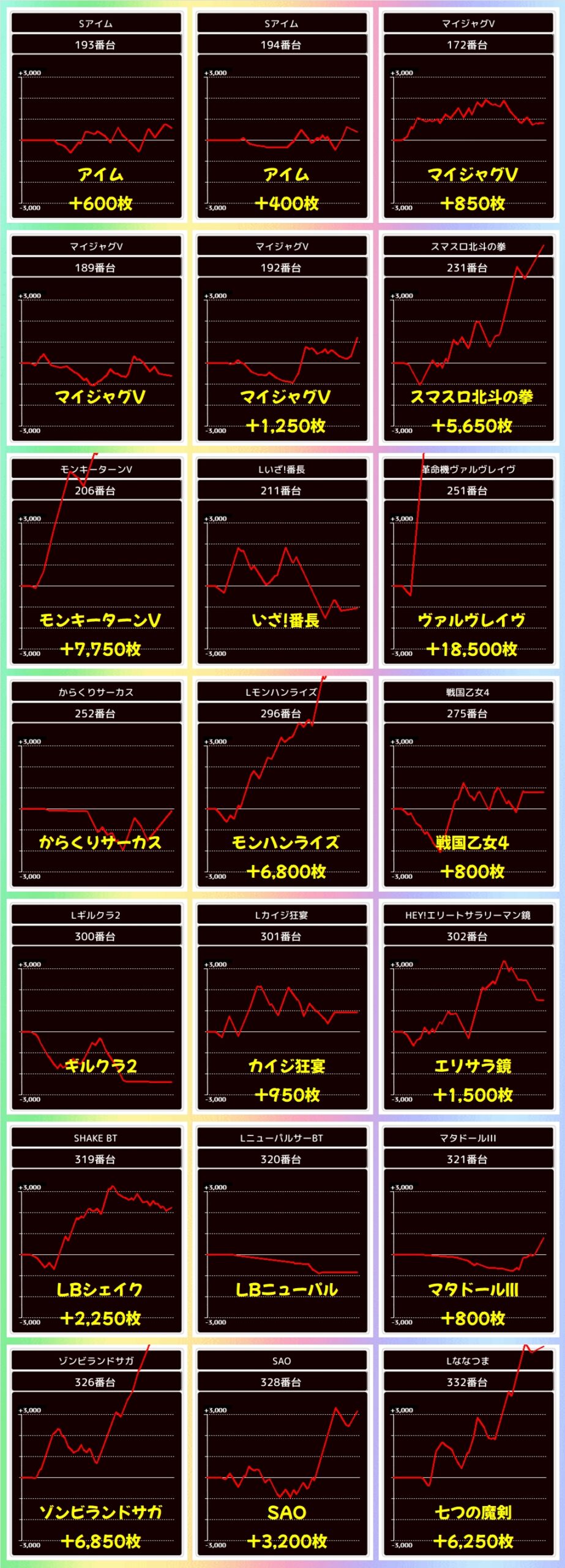 なお、冒頭で触れていたバラエティの並びですが、今回は3台並びを2箇所確認でき、どちらも大都機種が絡んだ並びになっていました。この結果を見ると、次回以降も強イベ日はバラエティの大都機種に注目しておいたほうが良さそうですね。