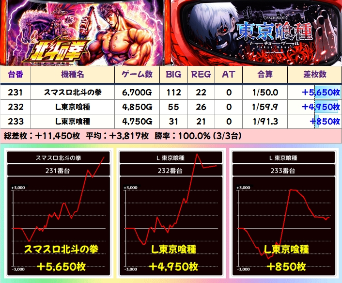 また、機種マタギと島マタギの並びも確認でき、今回は231~233番台の「スマスロ北斗」と「東京喰種」が島マタギの並びに!