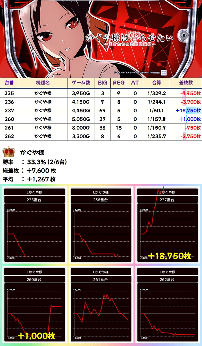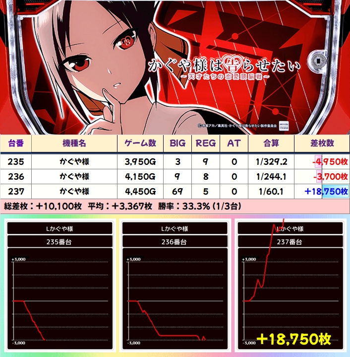 上記の3機種のからは大量出玉をしっかり確認でき、「かぐや様」からはコンプリートと思しき+18750枚の爆出し台が出現していました。