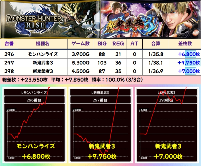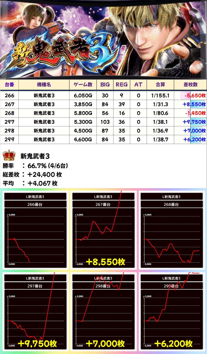 「新鬼武者3」は特に仕掛けの質が良かったようで、+9000枚超・+8000枚超・+7000枚・+6000枚超とド派手な出玉を複数確認することができました。