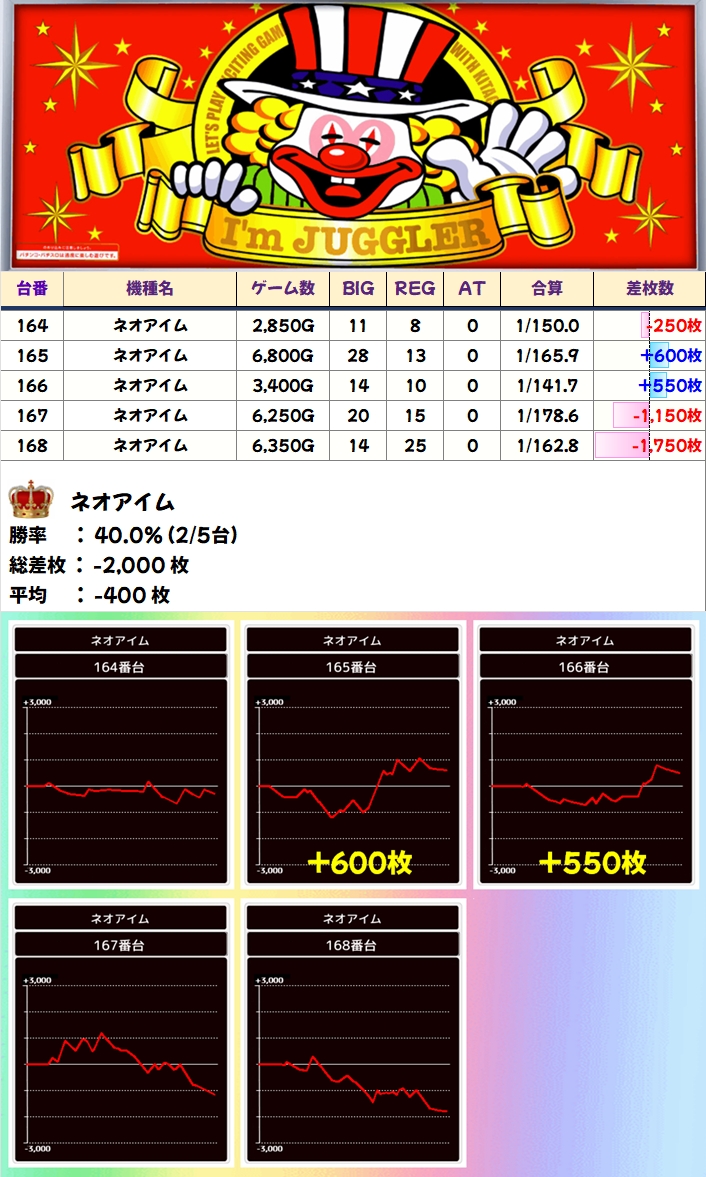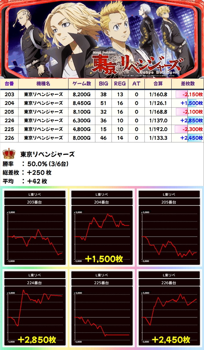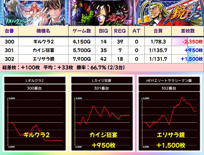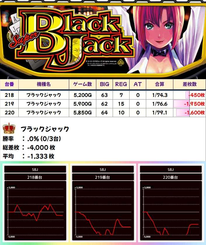 「ブラックジャック」に関しては3台ともマイナス差枚となっていますが、過去の実績や全台フル稼働していることを考えると、全台系だった可能性が高いのかなと。