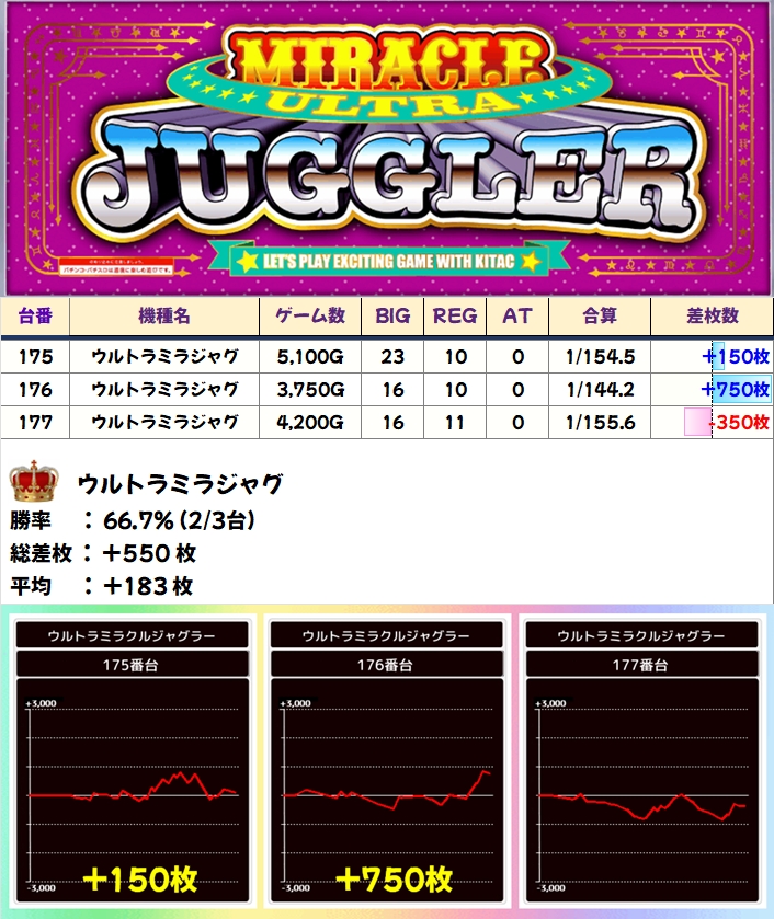 この日は3台設置の「ブラックジャック」と「ウルトラミラジャグ」が3台機種の全台系=3台並びと思しき結果になっていましたが、その他にも並び仕掛けと思しき箇所を多数確認!