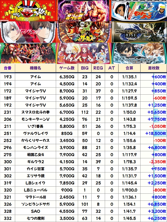 狙い目の機種としては事前ポストでも触れているハイスペックスマスロが挙げられ、その他にも定番機種の「北斗」「モンキー」「モンハン」「戦国乙女」の4機種からは毎回お宝台を確認できています。