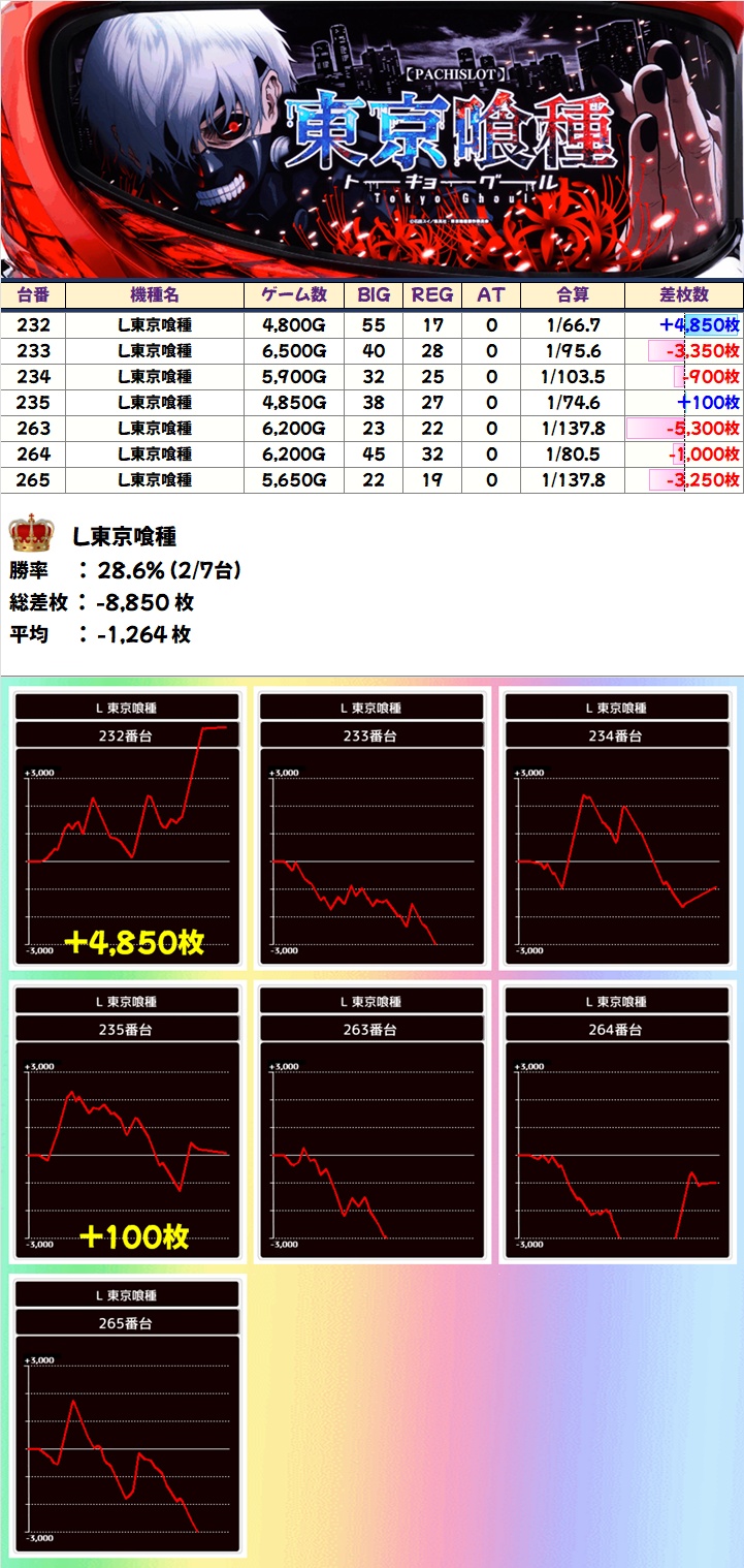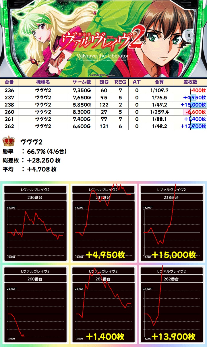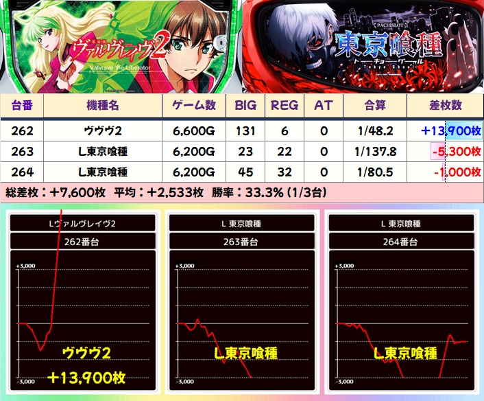 「東京喰種」からは+5000枚クラス、そしてこの日MVP級の活躍した「ヴヴヴ2」は複数の万枚など半数の台が爆発し、平均+4708枚と異次元の結果に!