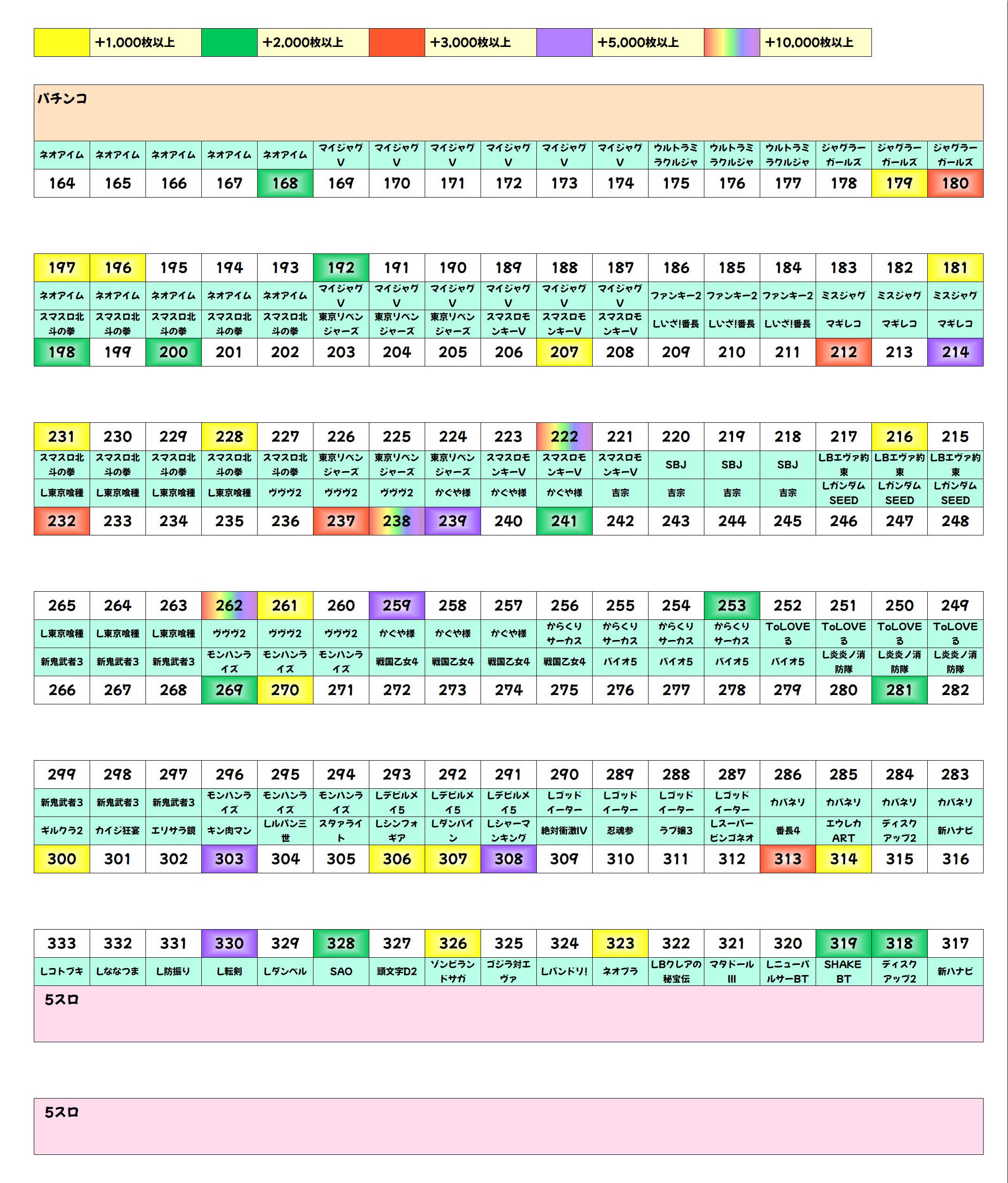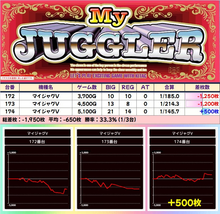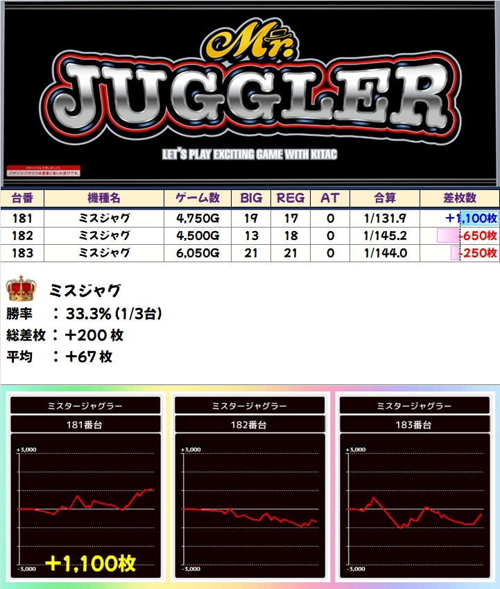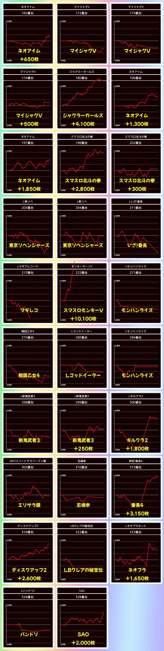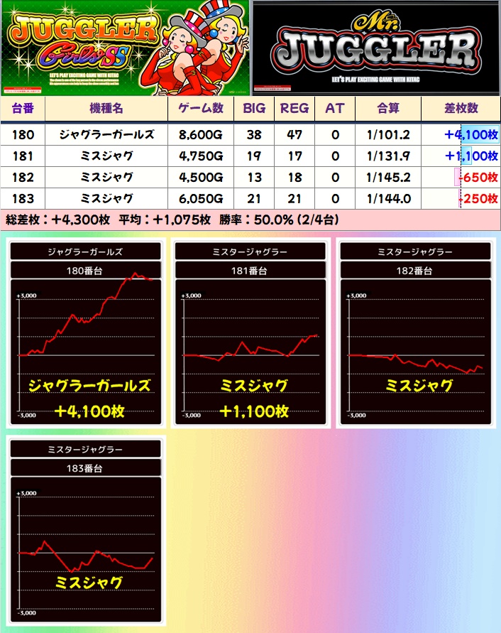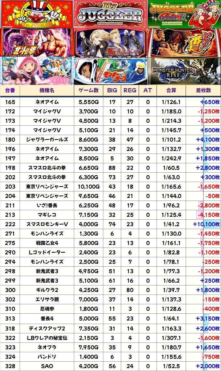 中でも「モンキー」の万枚オーバー、「ジャグラーガールズ」の+4000枚オーバーが特に目立っていました!