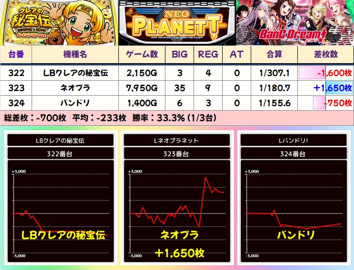 なお、冒頭で触れていたバラエティの並びですが、今回も大都機種(クレアの秘宝伝)が絡んだ並びになっていました。この結果を見ると、次回以降も強イベ日はバラエティの大都機種に注目しておいたほうが良さそうですね。
