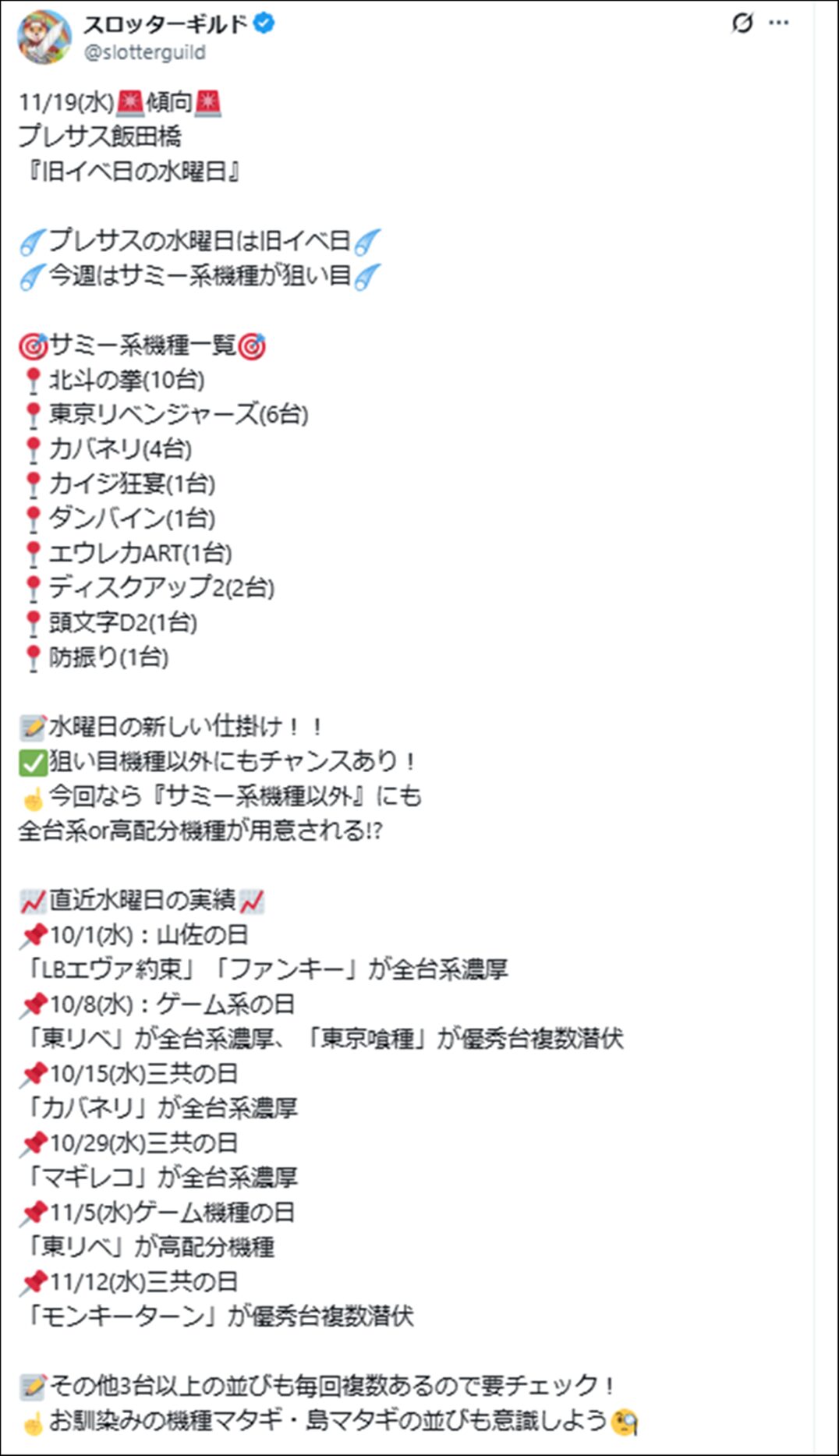 旧イベ日の水曜日は狙い目機種が用意されるのが定番で、狙い目機種は公式XとLINEの画像で示唆されるので事前のチェックは必至です!