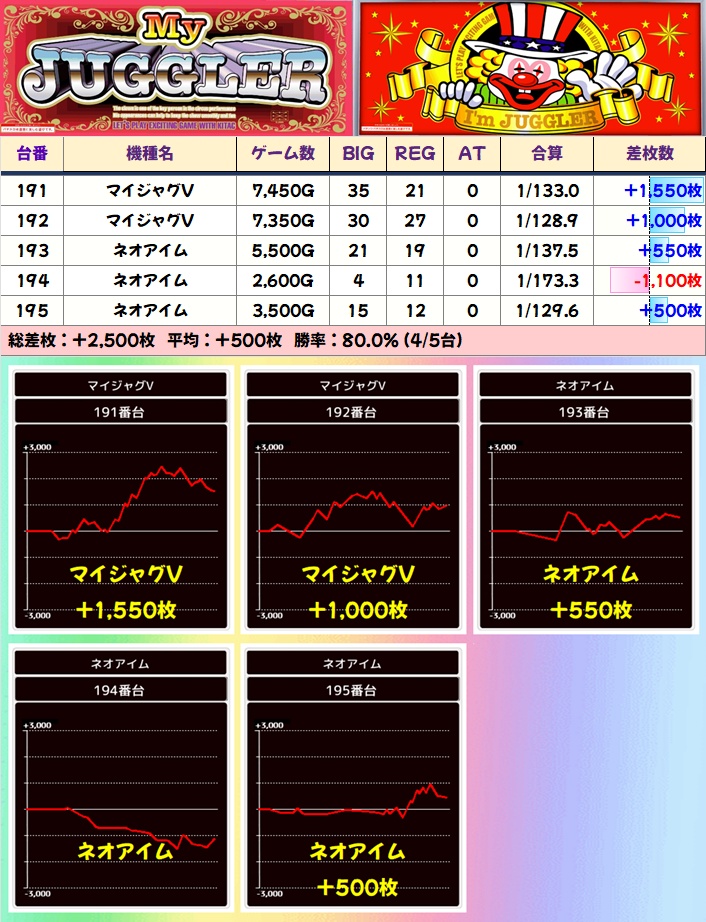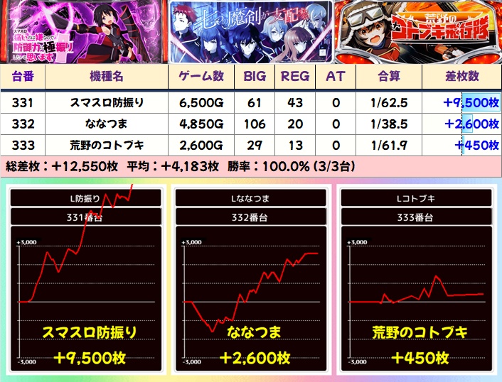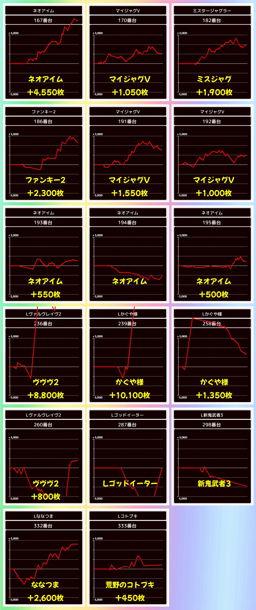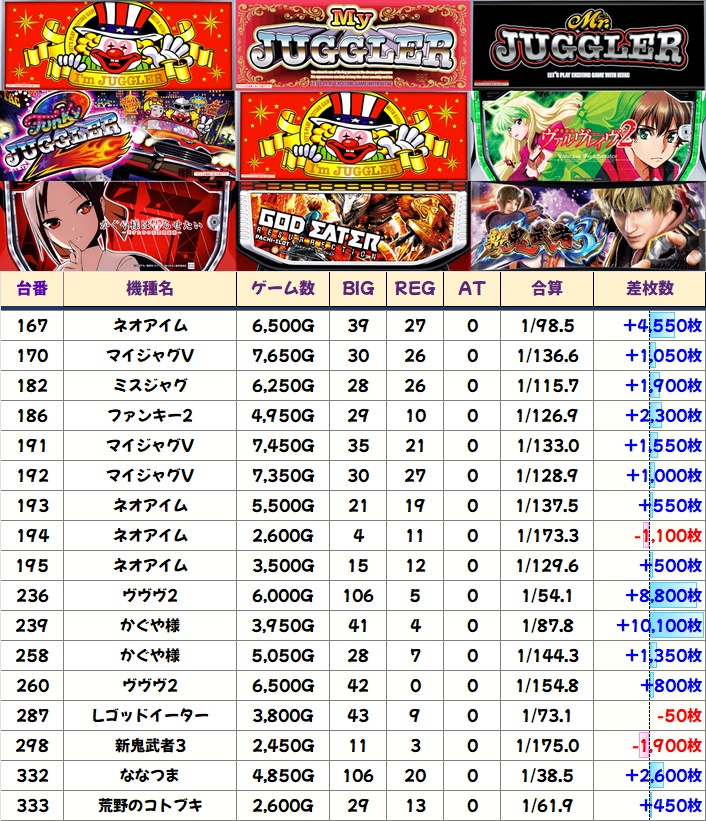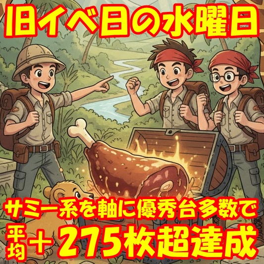 今回の水曜日もサミー系機種を中心に優秀台多数で平均+275枚と抜群でした!