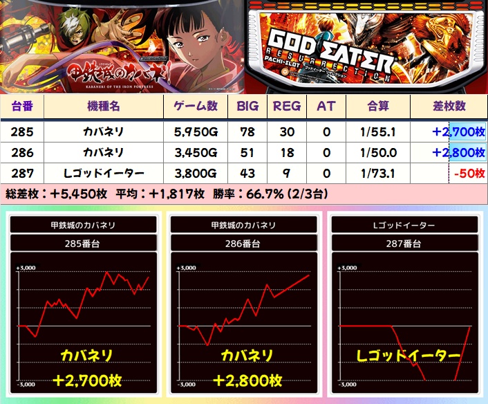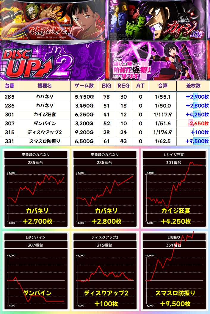 単品も充実しており、「カバネリ」は半分の台が+2500枚以上、バラエティからは「防振り」の+9500枚&「カイジ」の+4250枚などを確認!