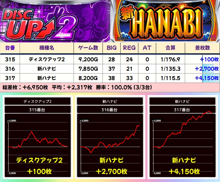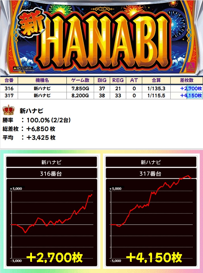全台系濃厚の2機種は全台+1000枚以上と安定!特に「新ハナビ」はテッペンも間違いなさそうな+4150枚の台もあり平均+3425枚と大爆発!