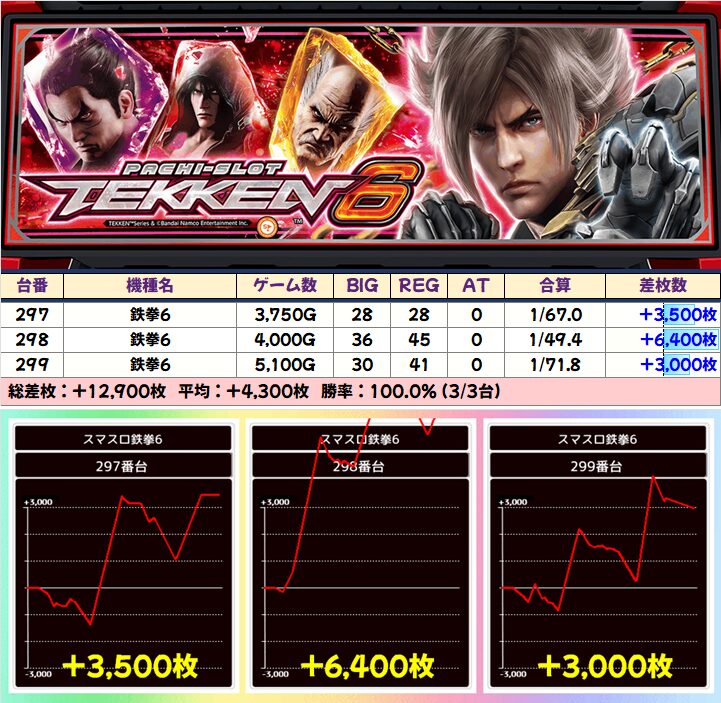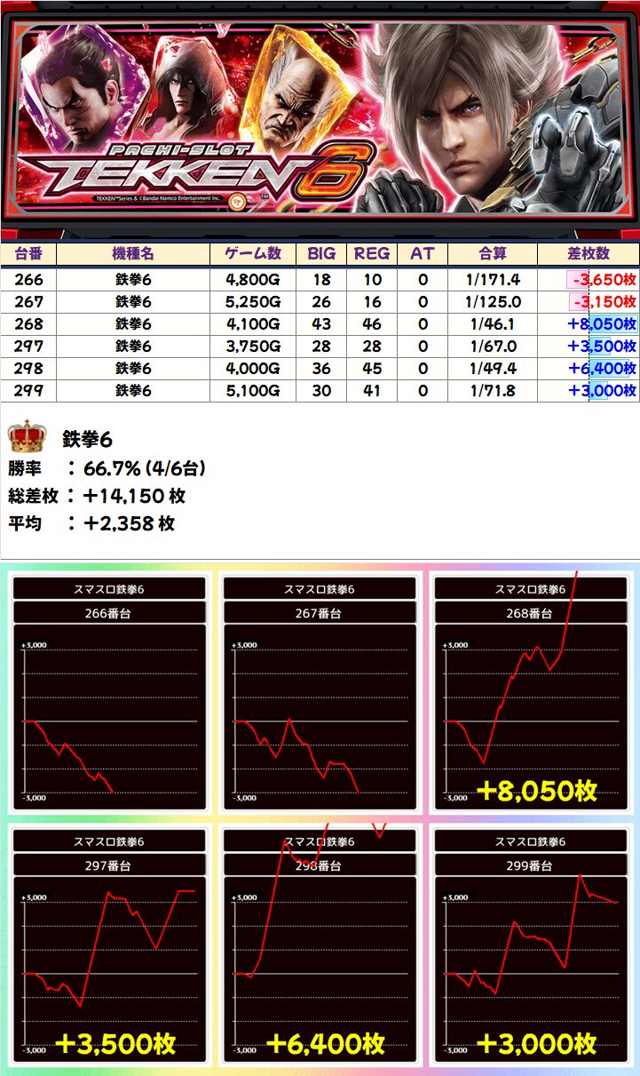 +8000枚を筆頭に6台中4台と半数以上の台が+3000枚を突破と見事な結果に!