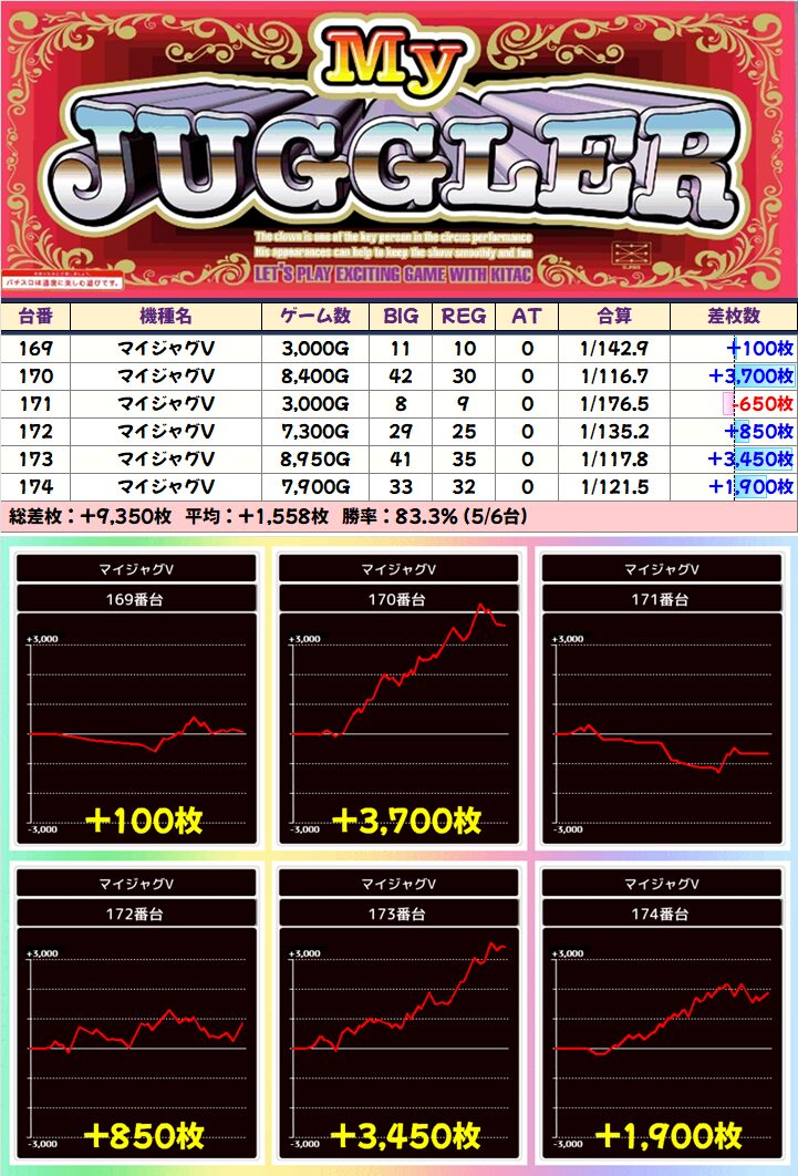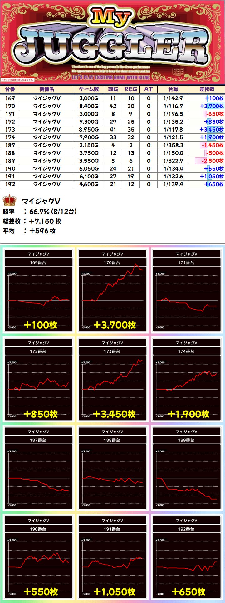 今回は3台以上の並びは平均+1500枚以上を叩き出した「マイジャグV」の6台並び、狙い目の山佐系機種、バラエティなどの定番を中心に計7箇所確認。