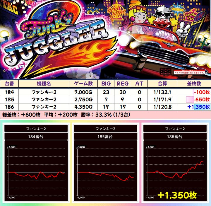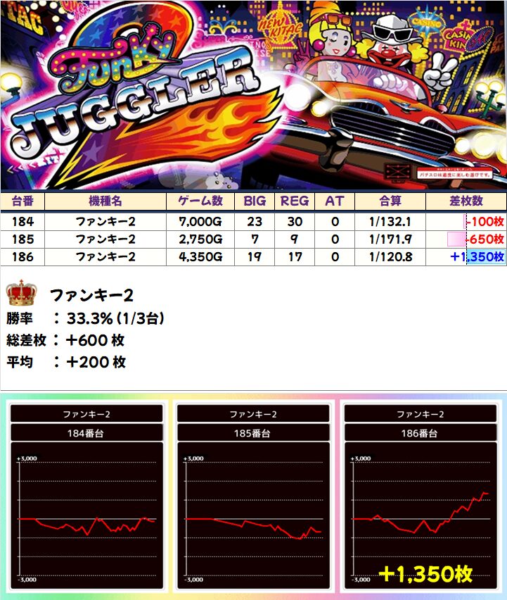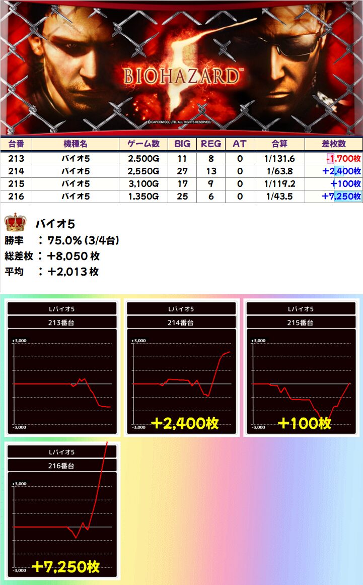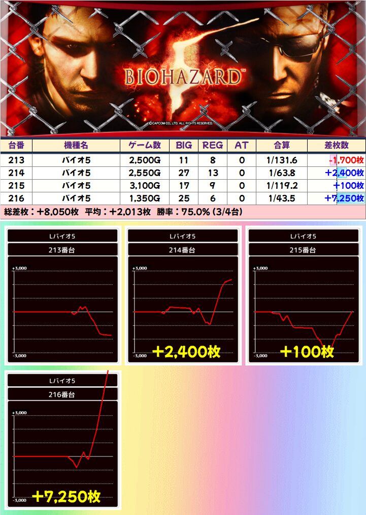 +7000枚以上を筆頭に4台中3台がプラスの「バイオ5」、仕掛けが頻発するジャグラーの3台設置から「ファンキー2」が全台系濃厚に!