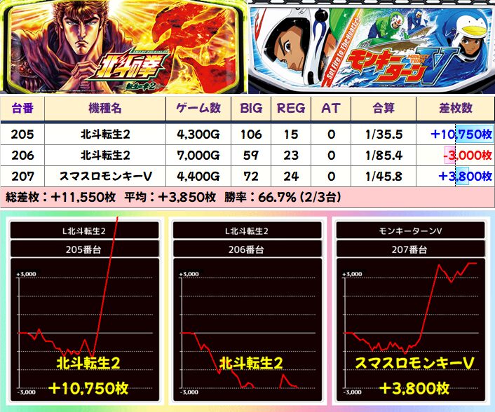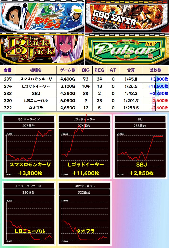 単品では万枚を突破した「ゴッドイーター」、大人気機種「モンキーV」&「SBJ」の+3000枚クラスなどを確認!