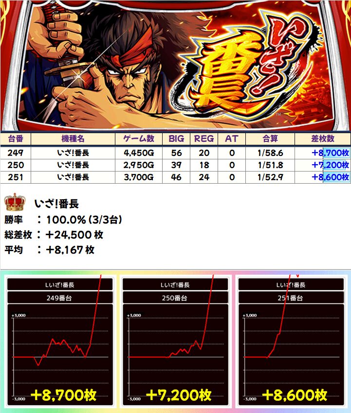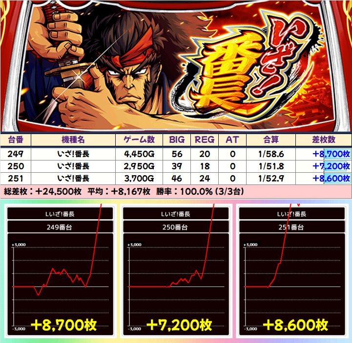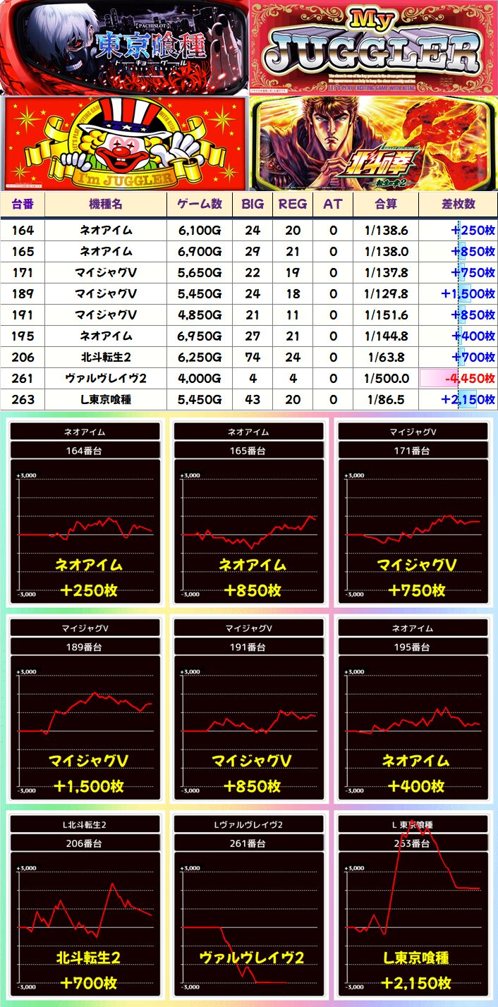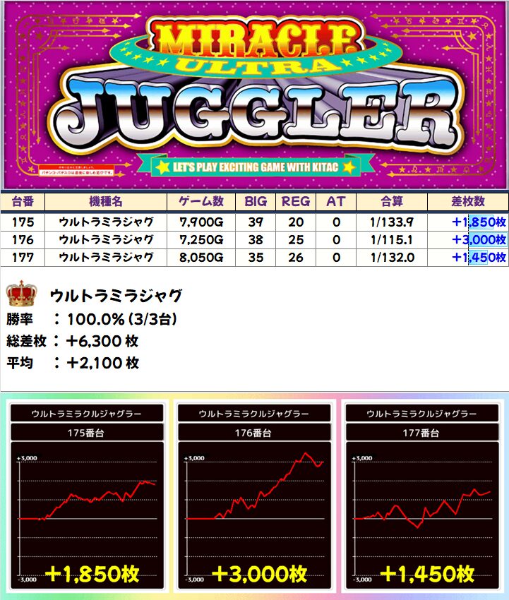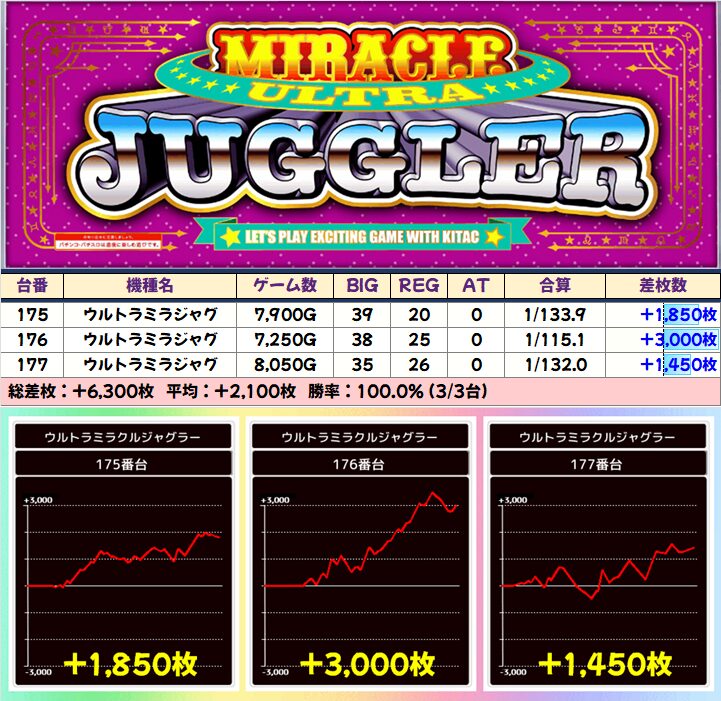 「いざ!番長」は全台+7000枚以上で平均+8167枚、「マイジャグV」も+3000枚を筆頭に全台+1000枚以上と抜群でした!ジャグラーの3台並びは高頻度で全台系になっているので今後も大注目!
