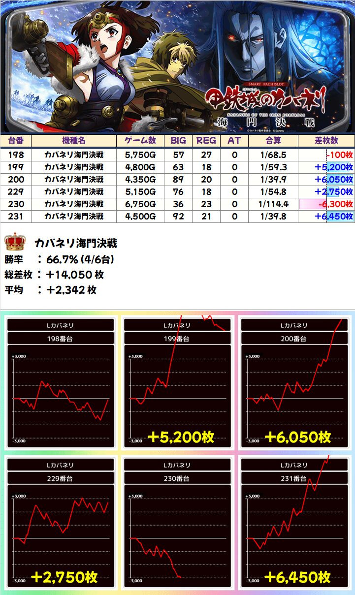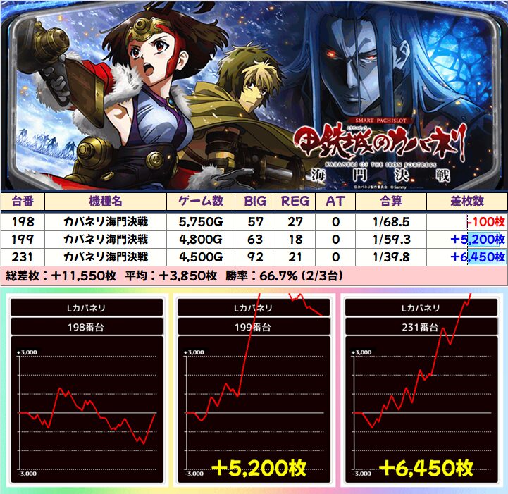 1/2系は導入直後の最新機種「カバネリ海門決戦」が早くも対象に!6台中3台と半数が+5000枚以上と躍動!