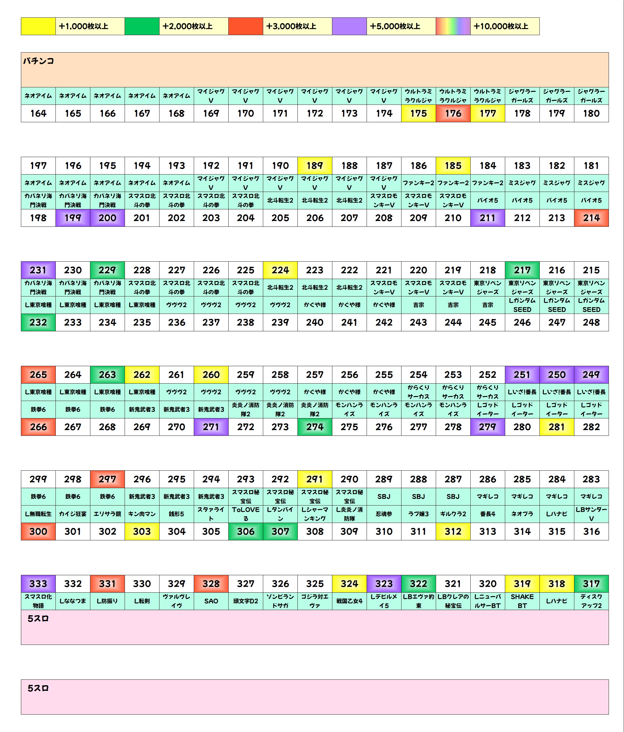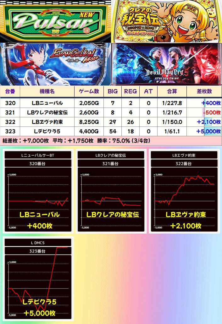 今回はバラエティの片列(317~333番台)が1/2系濃厚に!ゲーム系機種「デビクラ5」の+5000枚を筆頭に優秀台が続々!