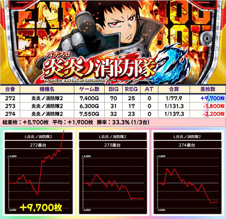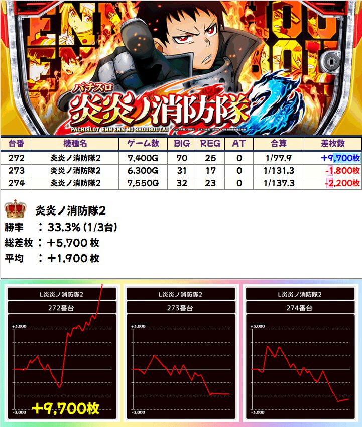 水曜日は1/2系の大量仕掛けに期待できますが、全台系のへの昇格機種もあります!今回の対象は「炎炎ノ消防隊2」&「ジャグラーガールズ」だった模様。「炎炎ノ消防隊2」には万枚クラスの猛爆台!「ジャグラーガールズ」も3台中2台が+1000枚クラスと安定!