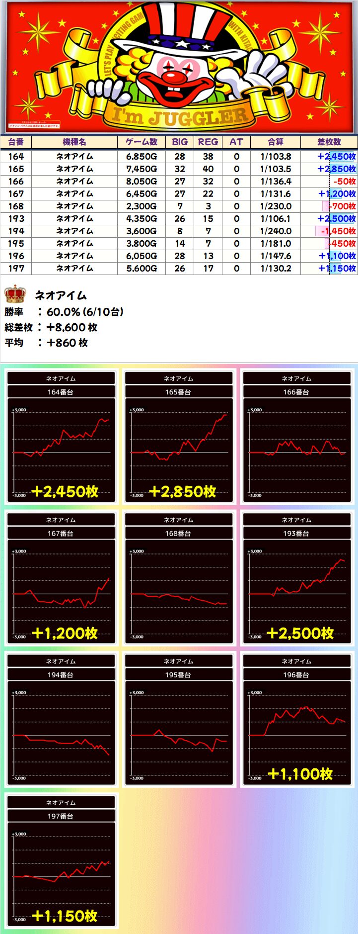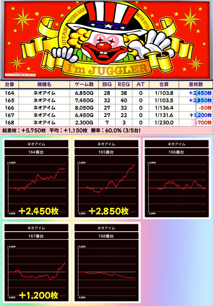 注目して欲しいポイントとしては、10台以上設置のジャグラー(マイジャグorネオアイム)が、高頻度で仕掛け対象(直近の8回中7回)になっていること!次回以降、この辺りを頭に入れながら立ち回ってみましょう!