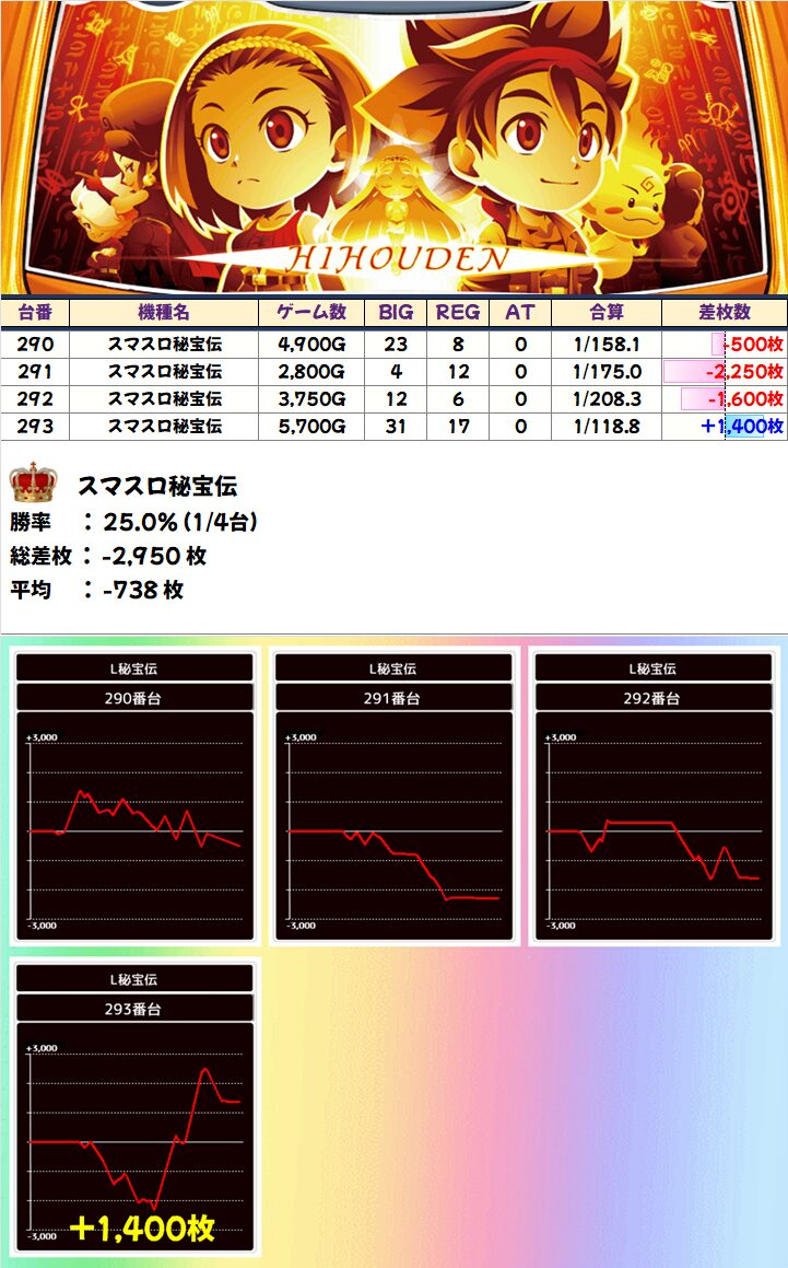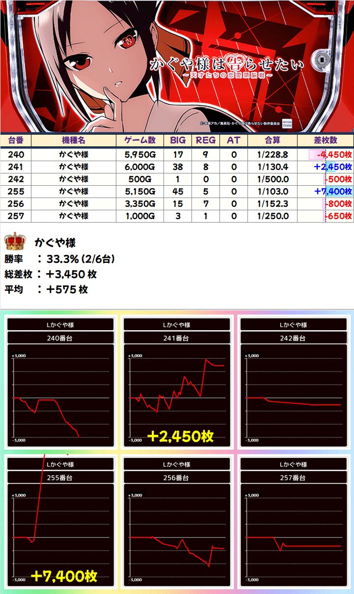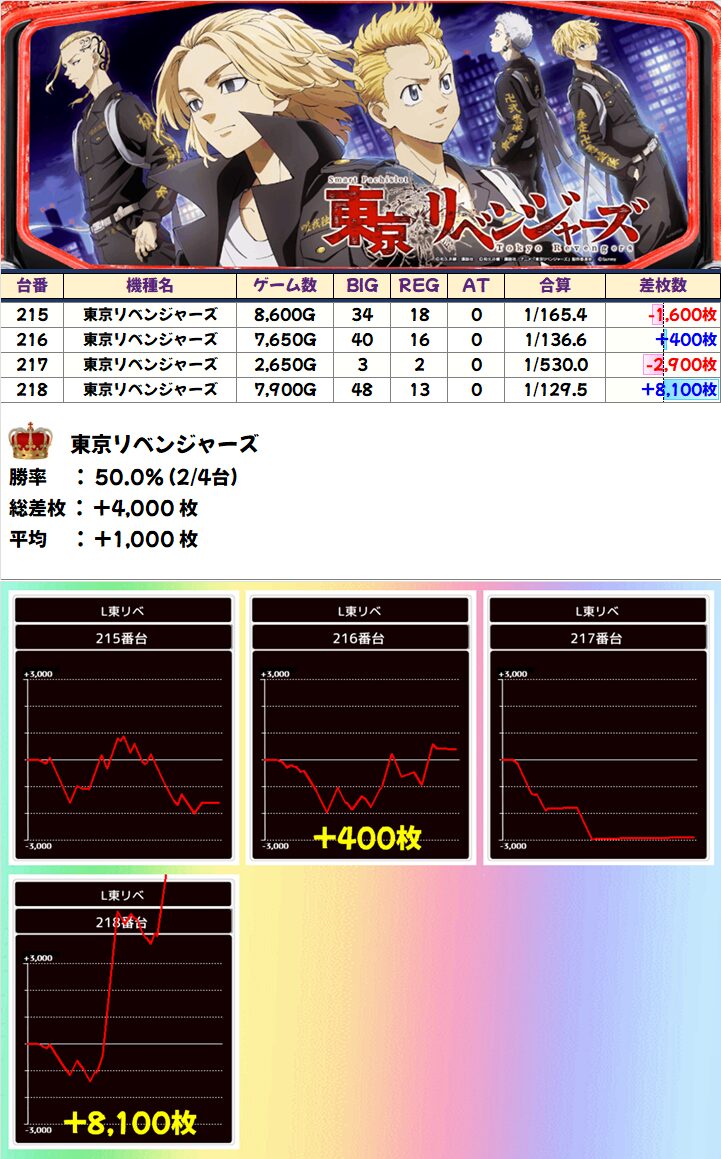 「東リベ」に+8000枚以上があったものの、全体的にやや不発気味。ただ、マイナス台もしっかり稼働しているので打ち手は手応えを感じていたかなと。