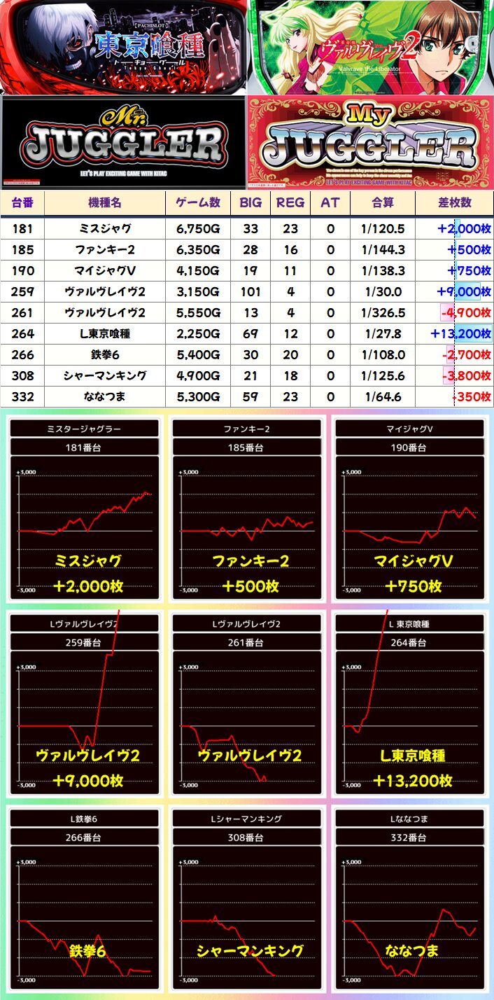 単品では大人気機種「東京喰種」の万枚オーバー、店舗の推し機種「ヴァルヴレイヴ2」の+9000枚などを筆頭に複数の優秀台を確認!