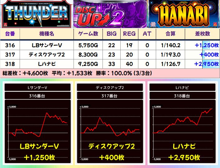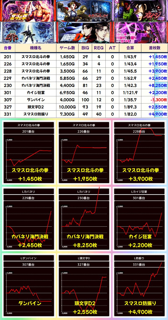 単品では最新機種「カバネリ海門決戦」の+8000枚以上、バラエティ「防振り」の+5000枚クラス、「頭文字D2」の+2500枚以上などが特に目立っていました!