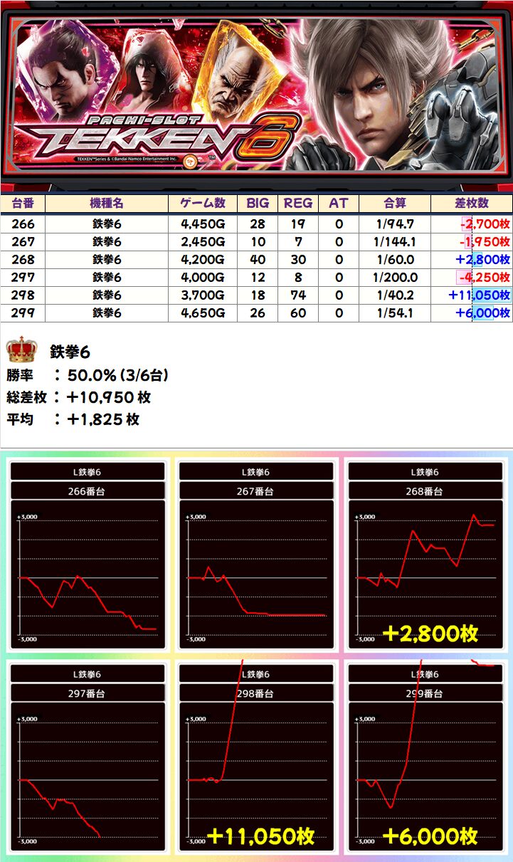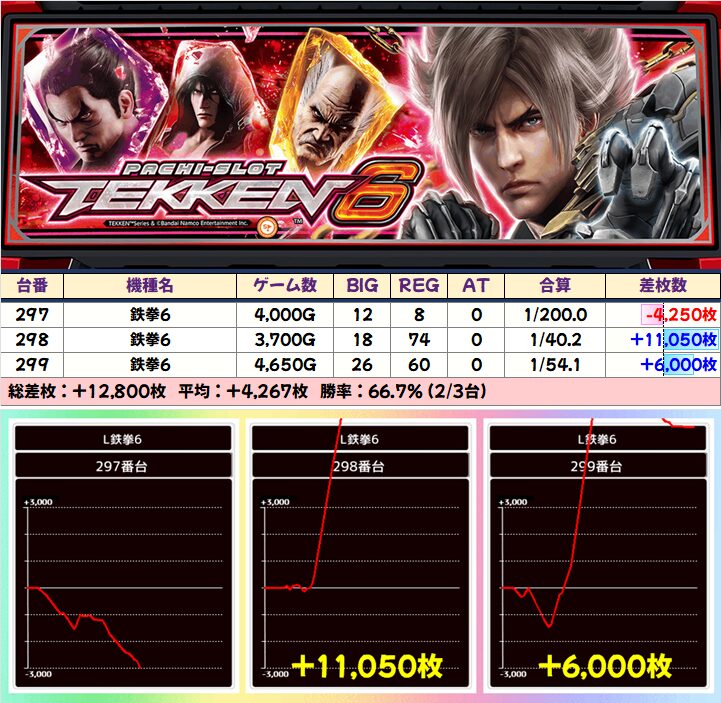 大半の機種が平均+1000枚以上かつ高勝率でしたが、中でも「鉄拳6」は万枚オーバー&+6000枚以上と複数の台が大爆発!