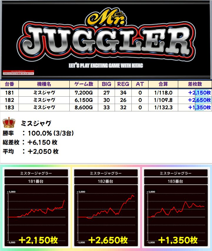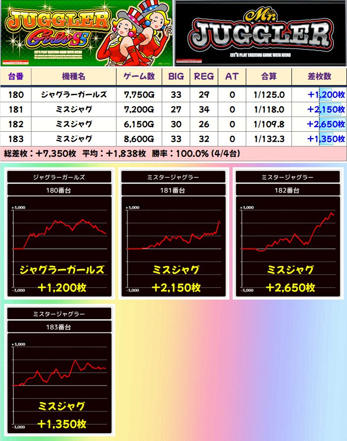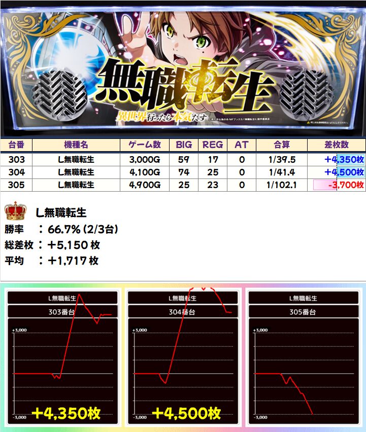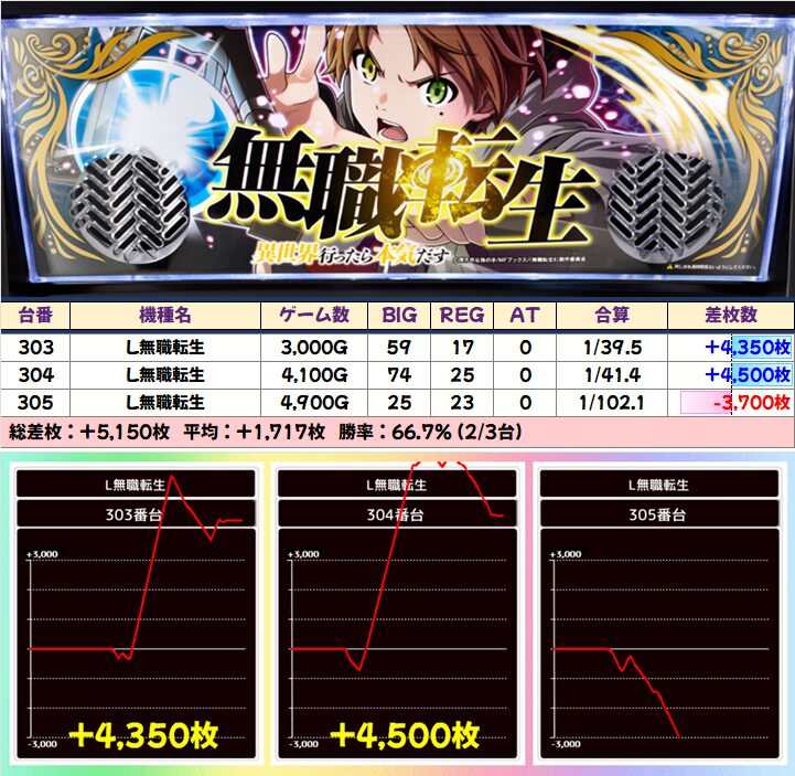 「L無職転生」は3台中2台が+4000枚以上、「ミスジャグ」も全台が+1000枚以上と高値安定!