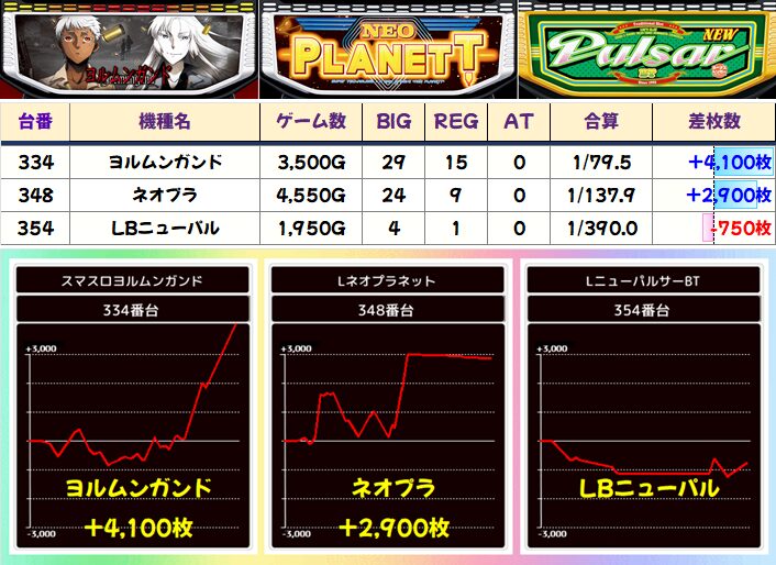 単品はバラエティから最新機種「ヨルムンガンド」の+4000枚オーバー、「ネオプラ」の+3000枚クラスなどを確認!