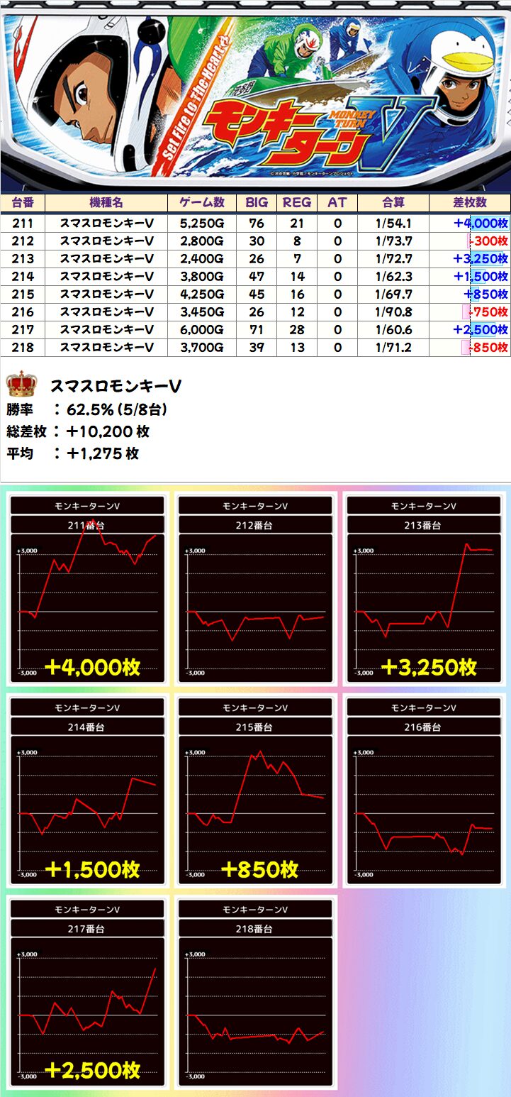 3台以上の並びはジャグラーから複数、狙い目である山佐系絡みでモンキーV、機種マタギ&島マタギ、バラエティなど普段以上に充実で計8箇所もあった模様!