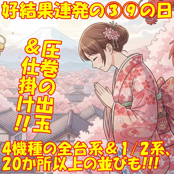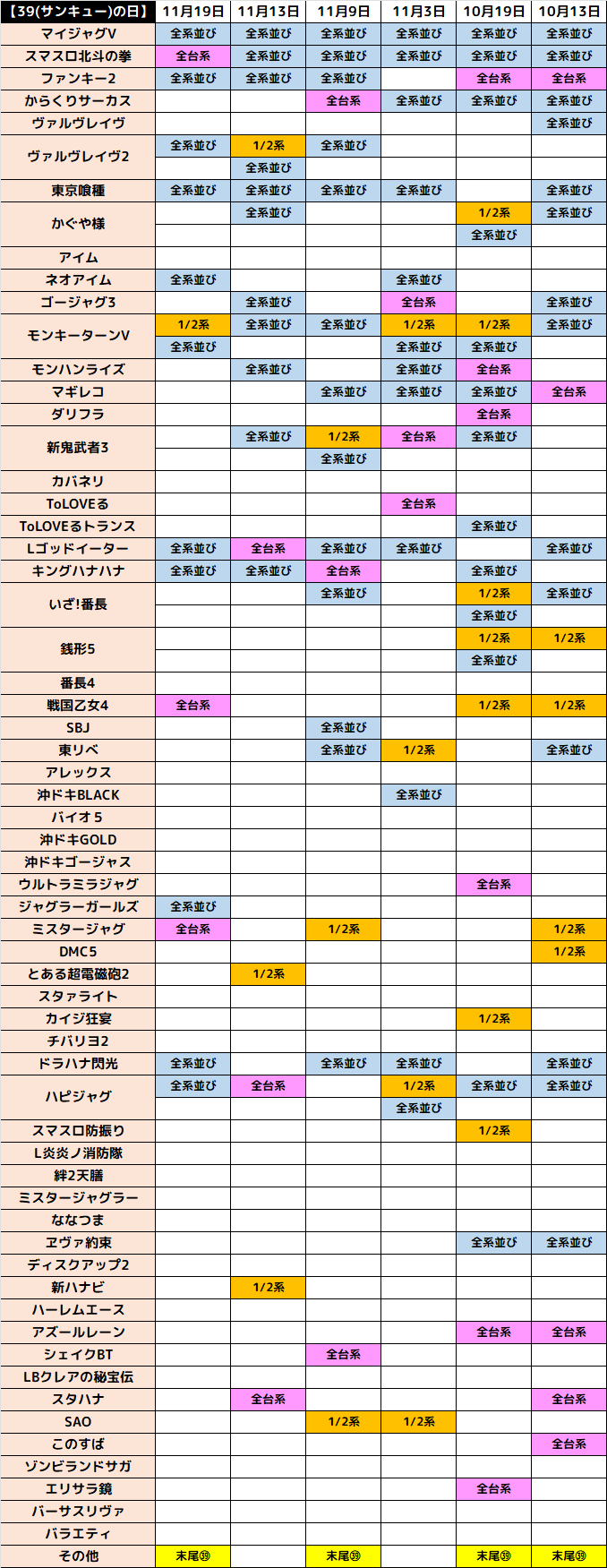 11月3日(月・祝)|エスパス新宿歌舞伎町|優秀な3台並びが20か所以上と大量!そのほかにも全系や高配分機種複数と10月に引き続き39の日は仕掛け盛り沢山!