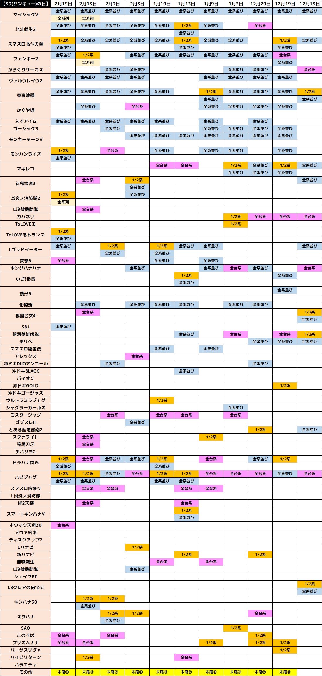 2月19日(木)|エスパス新宿歌舞伎町|お馴染みの③⑨仕掛け!大量の③台並びを筆頭に③機種以上の全台系や末尾㊴など纏わる仕掛けが多数出現!もちろんその他の仕掛け&単品も抜かりなし!