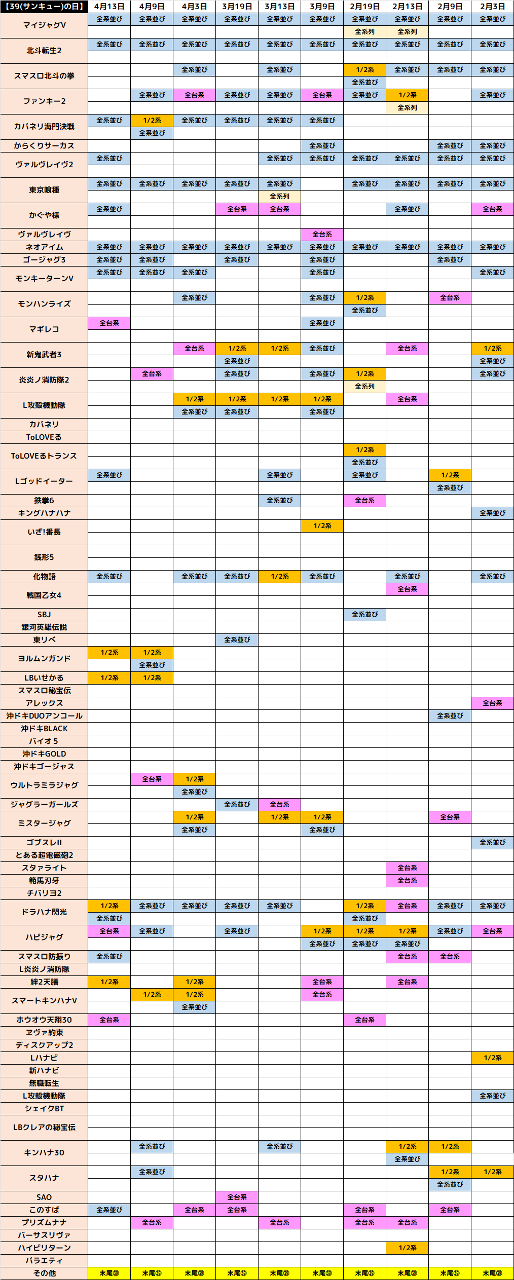 4月13日(月)|エスパス新宿歌舞伎町|39の日鉄板の末尾39は平均+3000枚オーバー!!3台以上の並びも20か所以上と大量で、多くの並びが平均+2000枚クラスを叩き出す!!