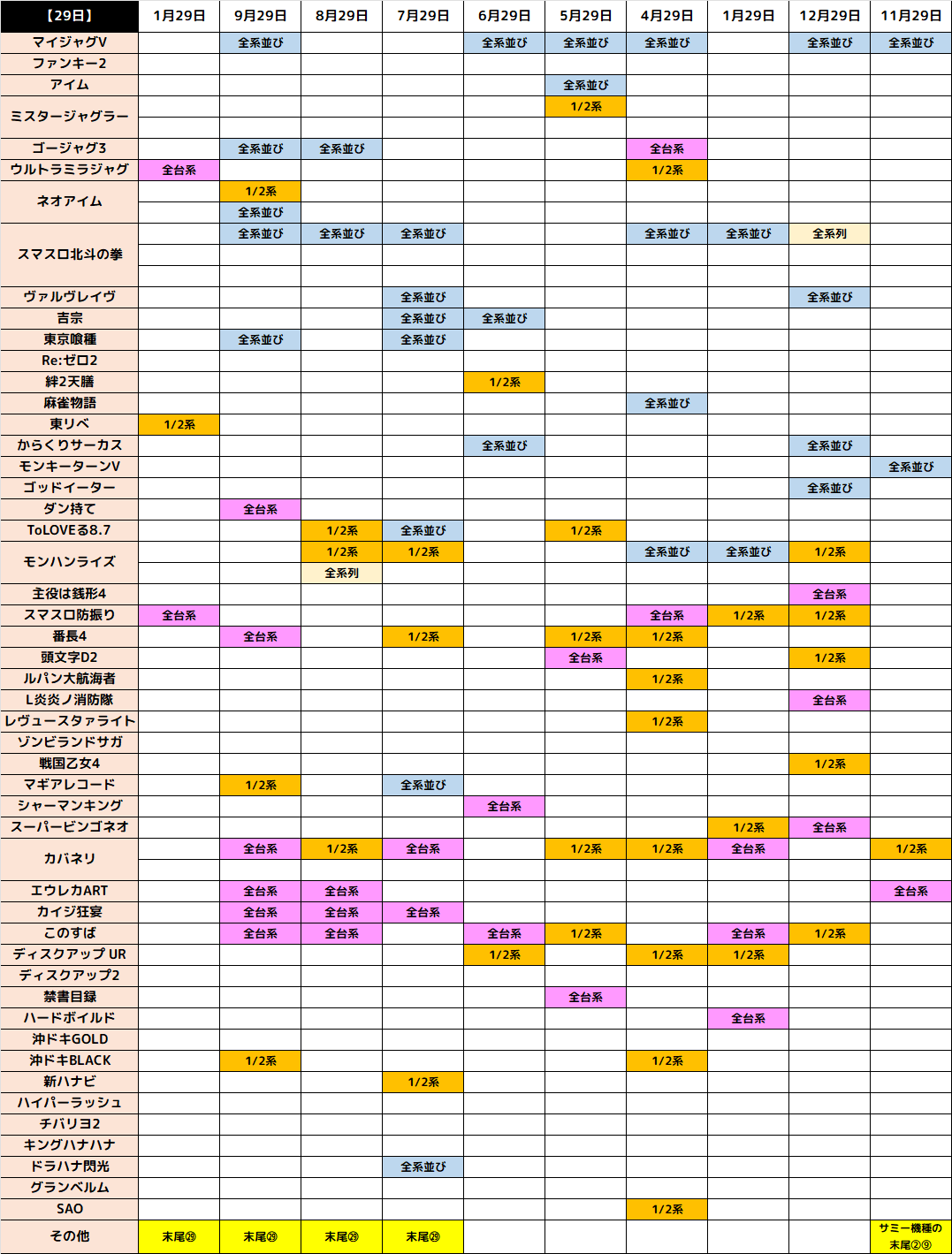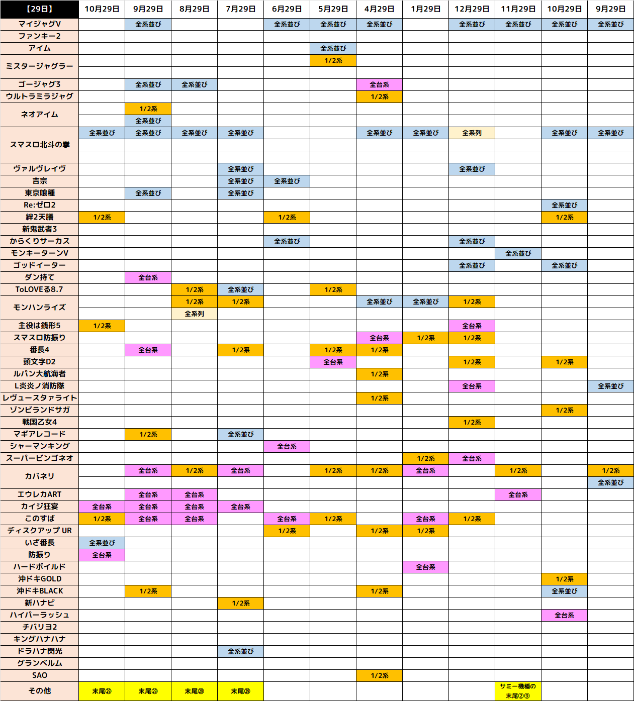 8月29日(金)│エスパス新宿歌舞伎町│29(ニク)の日関連機種から「このすば(サミー機種)」など3機種が全台系濃厚に!他にも1/2系濃厚、優秀列&並びからも29(ニク)の日関連機種を確認! 単品から3台の万枚も!