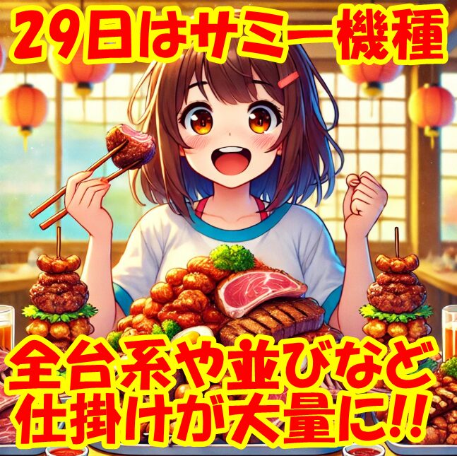 9月29日(月)|エスパス新宿歌舞伎町|月イチの肉の日でサミー機種から全台系や並びなど仕掛けが多数!さらに末尾の仕掛けも出現!もちろんサミー機種以外からもお宝台は多数で万枚オーバーも複数アリ!
