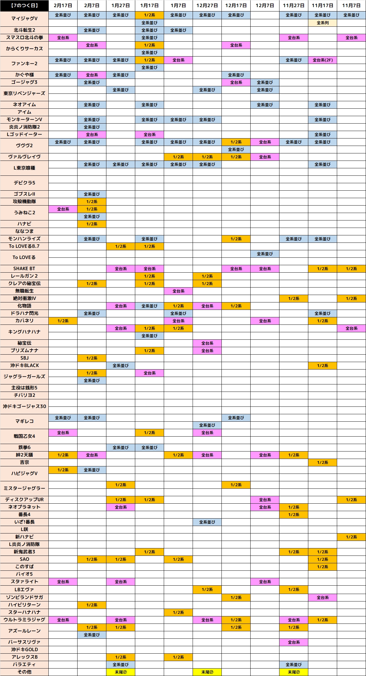 1月17日(土)|エスパス新宿歌舞伎町|3機種の全台系濃厚、11機種の1/2系濃厚、18か所の3台以上並びなど”7のつく日”らしく店内各所に優秀台多数!万枚オーバーは驚異の12台!