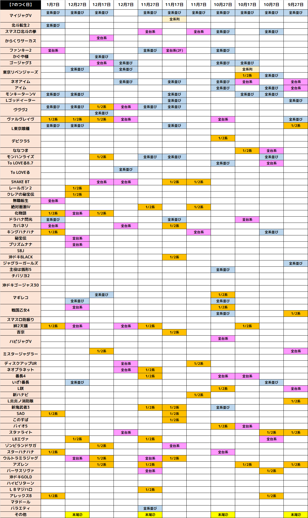 10月7日(火)|エスパス新宿歌舞伎町|創業月間×7の日で全台系濃厚機種が大量!3台以上機種にお宝台多数で複数機種にお宝台あり!バラエティやキャラ誕機種も優秀!