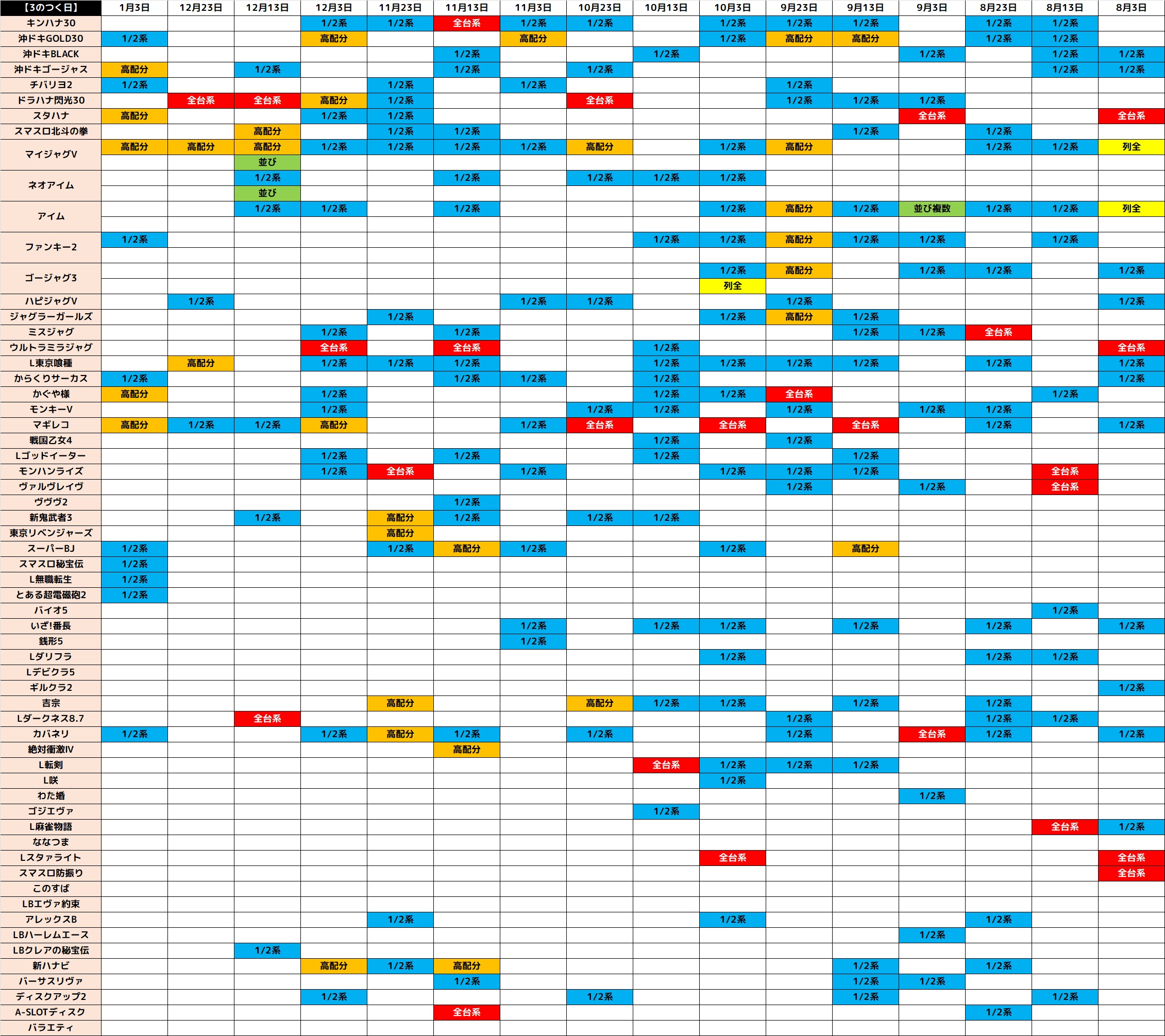 8月3日(日)│エスパス新小岩│3の日は沖スロを筆頭に高配分仕掛け多数!今回も全台系&1/2系濃厚の高配分機種や優秀列など充実した仕掛けが盛り込まれ、数多くの機種で大量出玉の優秀台を確認!