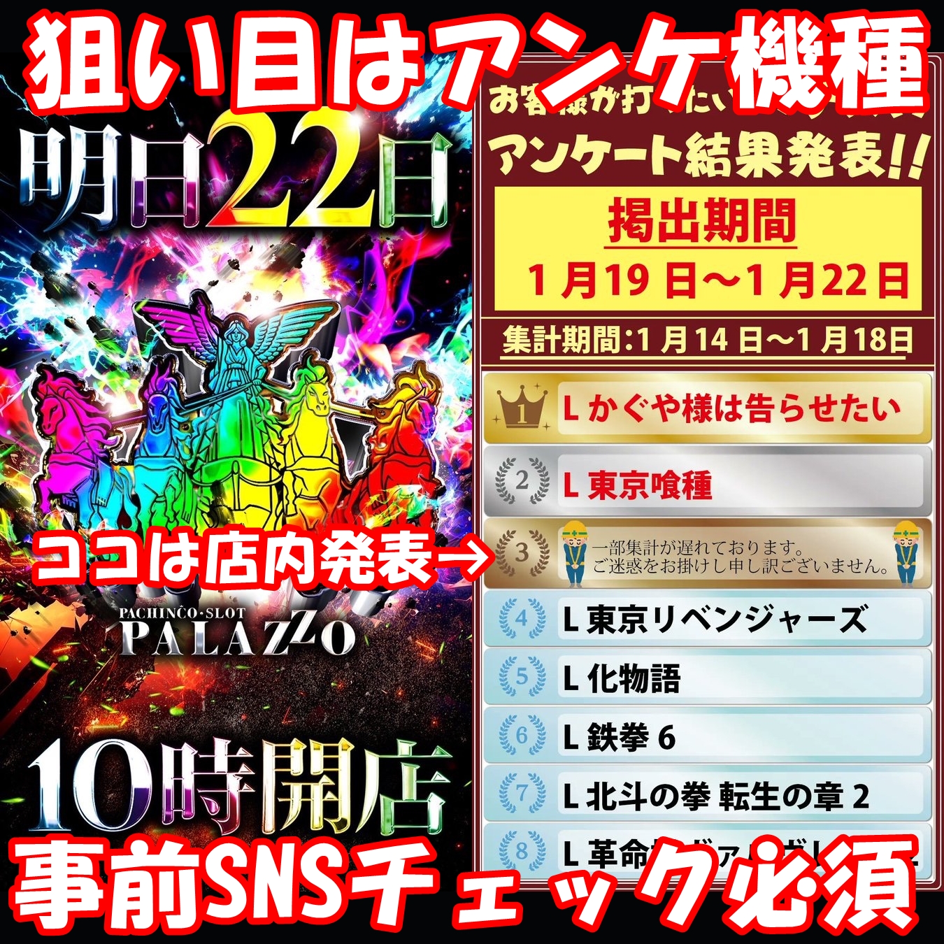 1月22日(木)│パラッツオ三郷中央│毎月22日、攻略のカギはBT機や新台、アンケートの順位機種にあり。喰種・東リベ・化物語はランキング機種から高配分で優秀な結果に!それ以外にもお宝箇所が続々登場!?