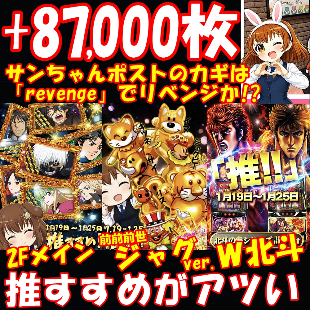 1月26日(月)|エスパス新宿歌舞伎町|6の日で末尾の仕掛けは平均+2000枚超の好成績に!王道の仕掛けも全台系濃厚から平均5000枚超の爆裂が複数アリ!激熱7days対象フロアからも大量出玉続出で総差枚は+9万枚オーバー!