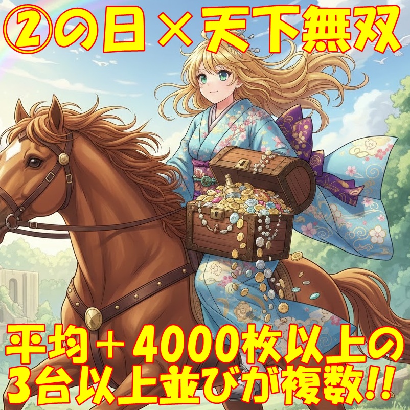 1月22日(木)|パラッツォ馬橋駅前│②の日×天下無双!複数の全台系、「ヴヴヴ2」&「東京喰種」&「マギレコ」から平均+4000枚を超える優秀過ぎる並びが炸裂!